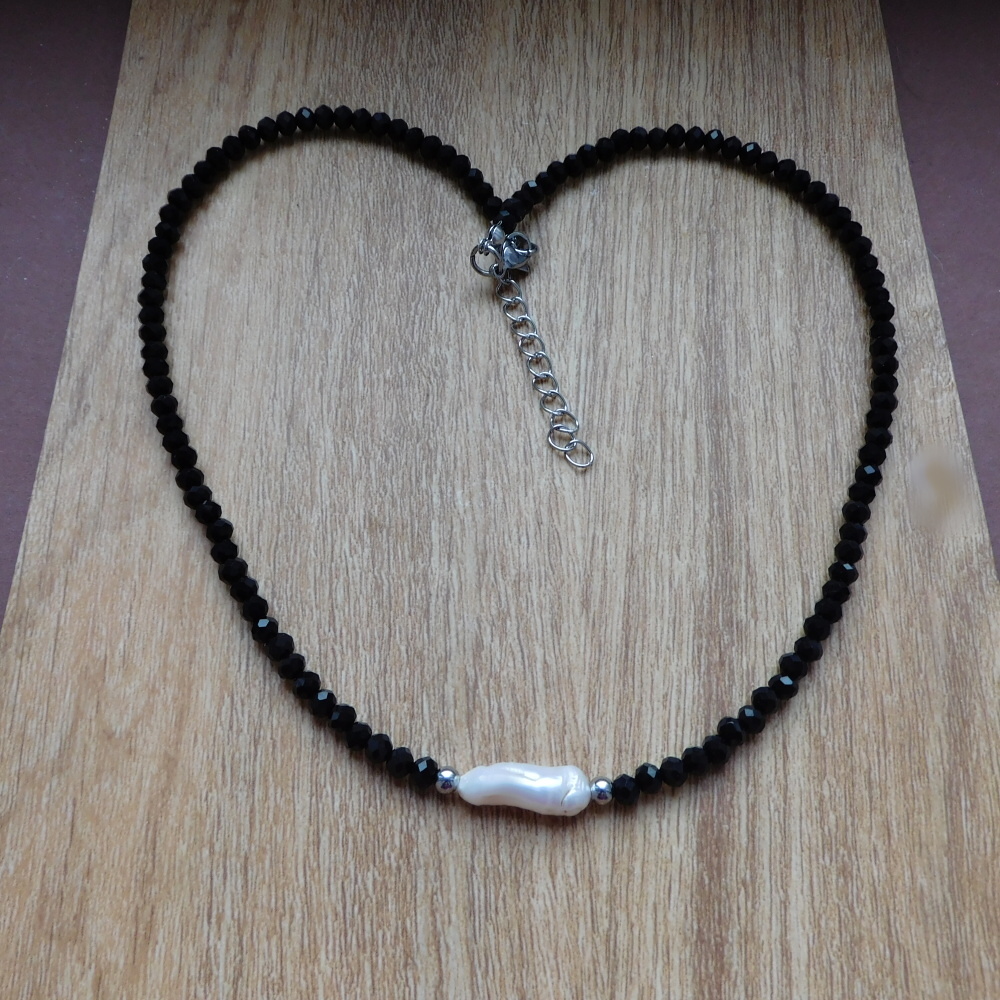 Náhrdelník je vyrobený z malých černých broušených kamínku spinel,nerezu a větší bílé perly typu Biwa