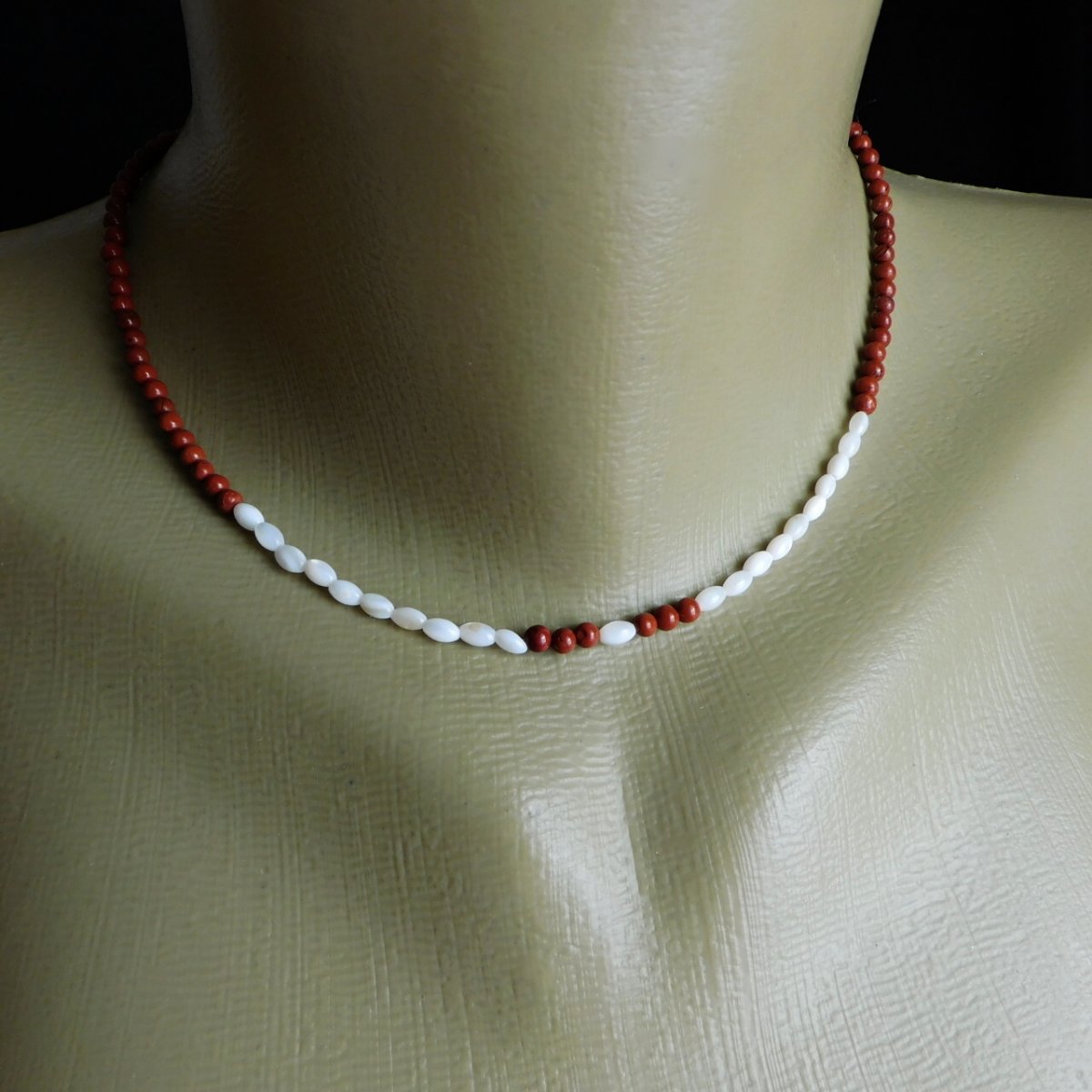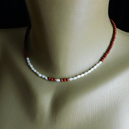 Náhrdelník vyrobený z krásných malinkých bilých oválných perleťových korálků a kuliček červeného jaspisu, sváteční