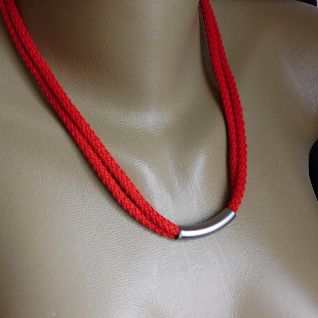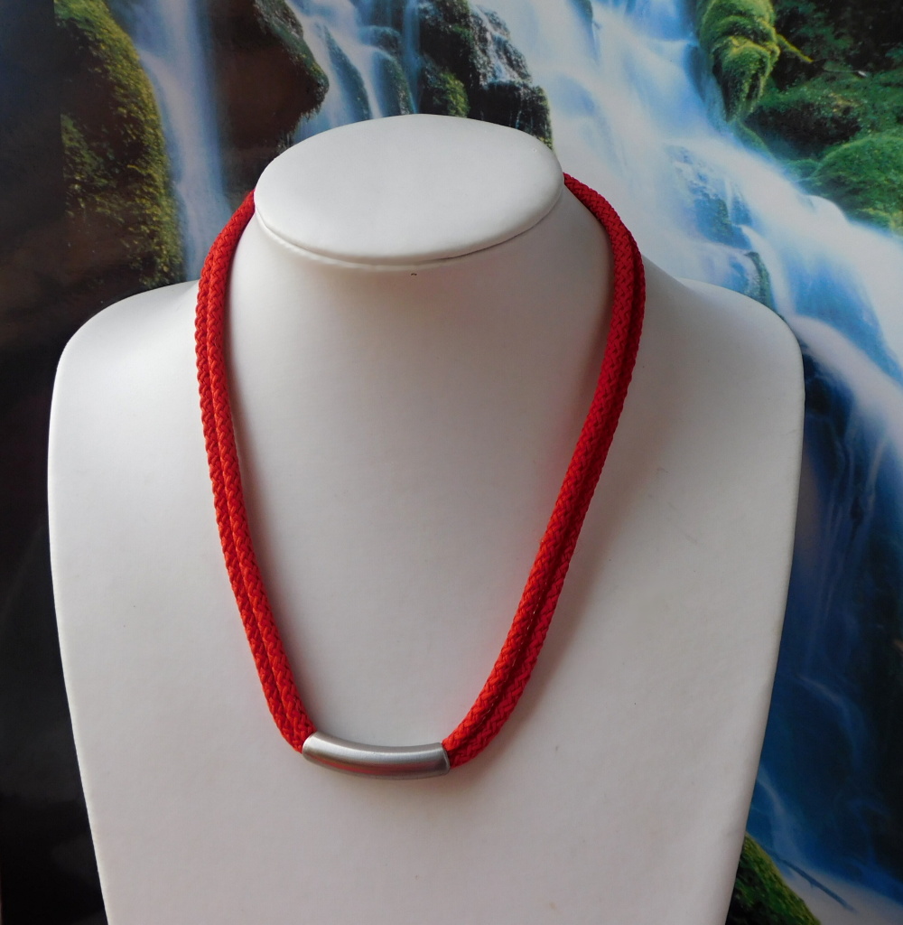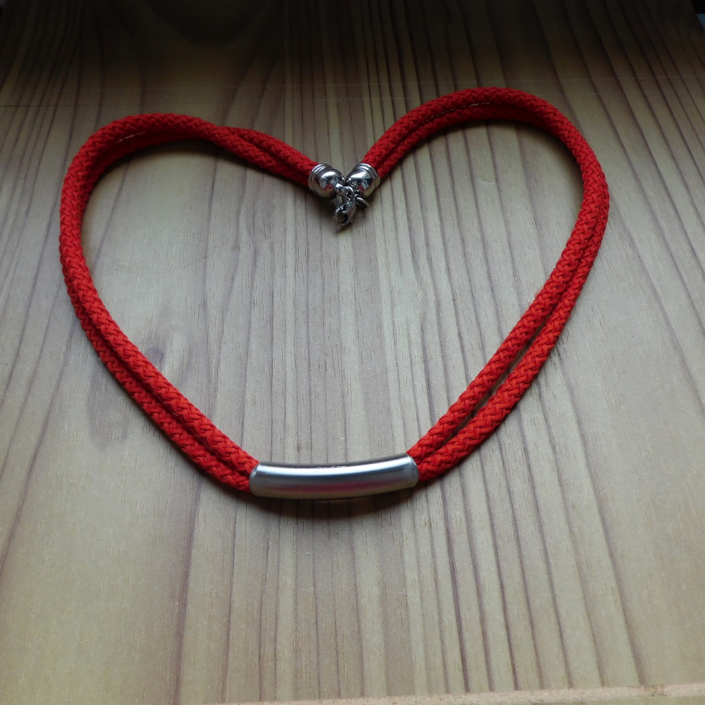 Lanový náhrdelník z červeného dvojitého lanka ručně vyrobené, vytvarované leštěné trubičky.