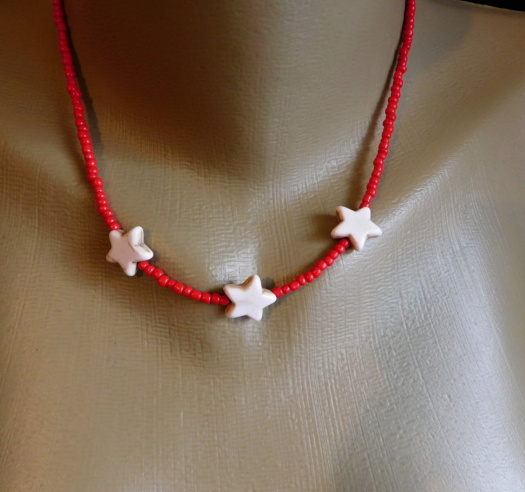 Náhrdelník je vyrobený z malinkých červených skleněných korálků- preciosa, rokajl a malých hvězdic z bílého howlitu.....