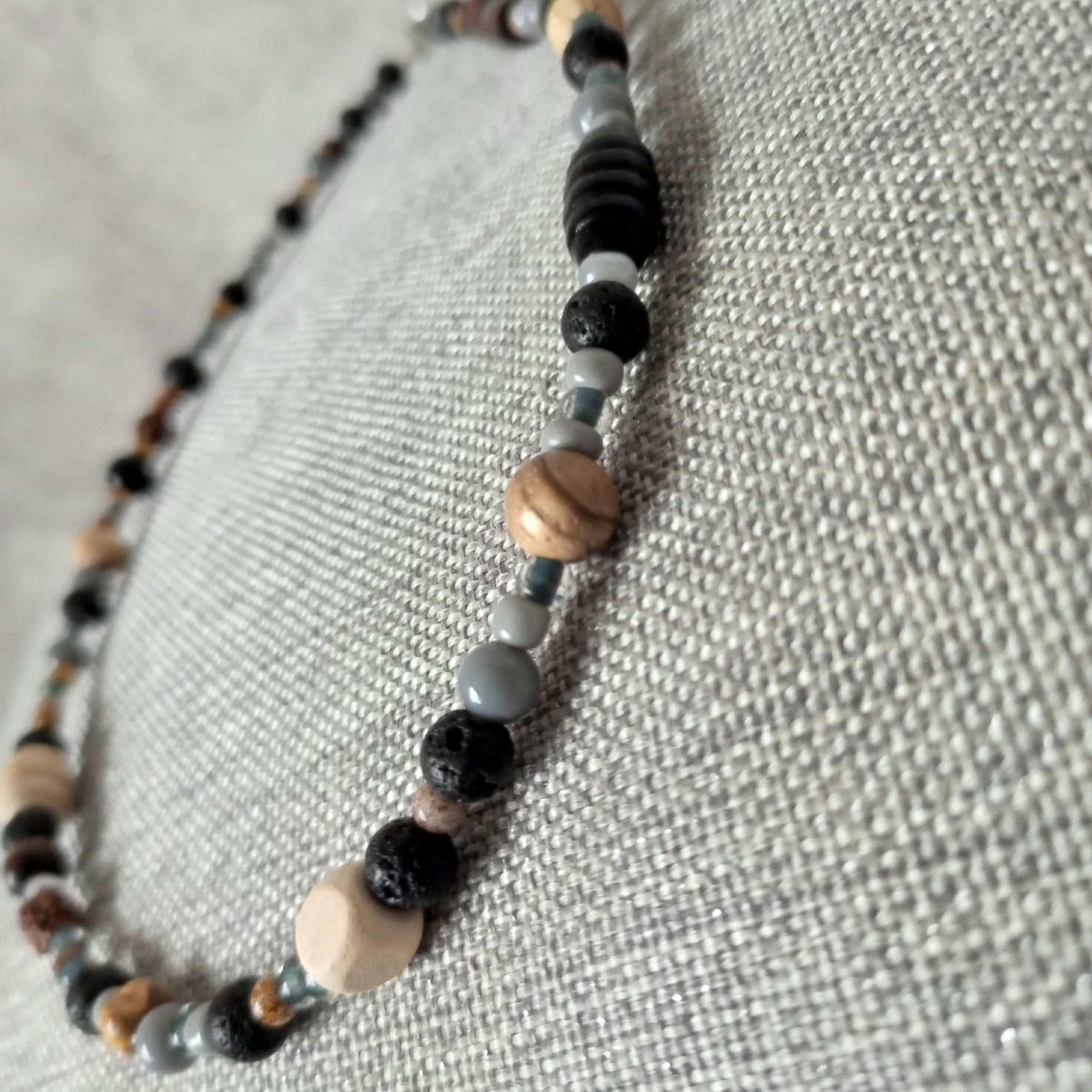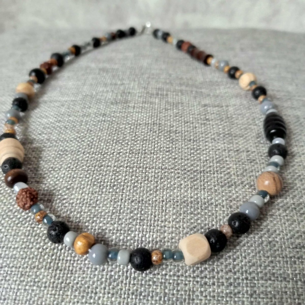 Náhrdelník v etno stylu ze dřevěných a skleněných korálků a semínek rudrakshi a lávy. Nejmenší korálky mají 3mm a největší délku 15mm.