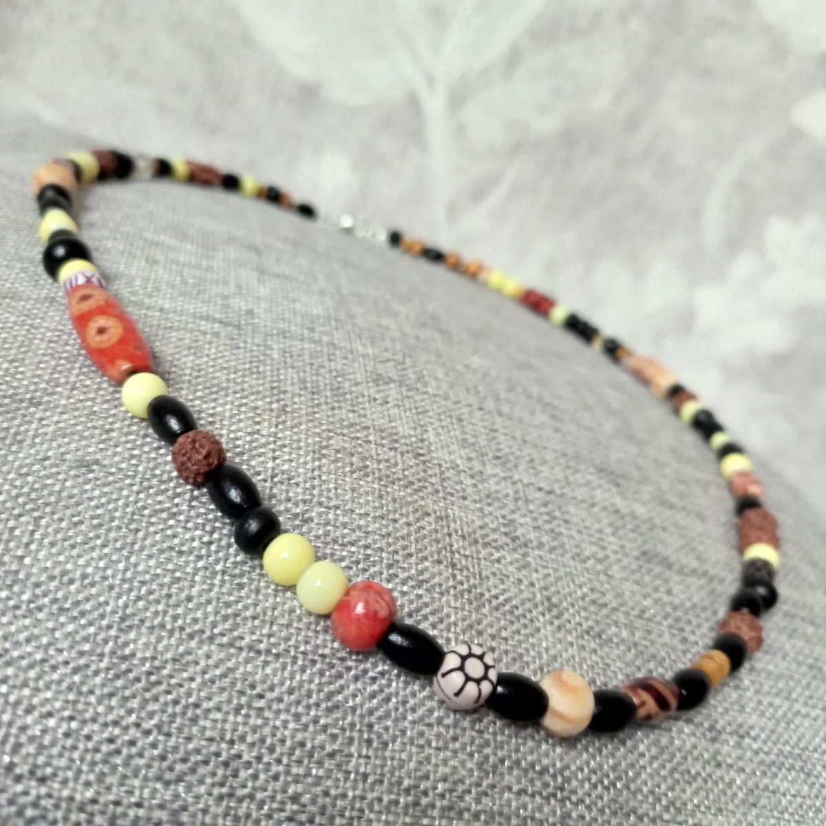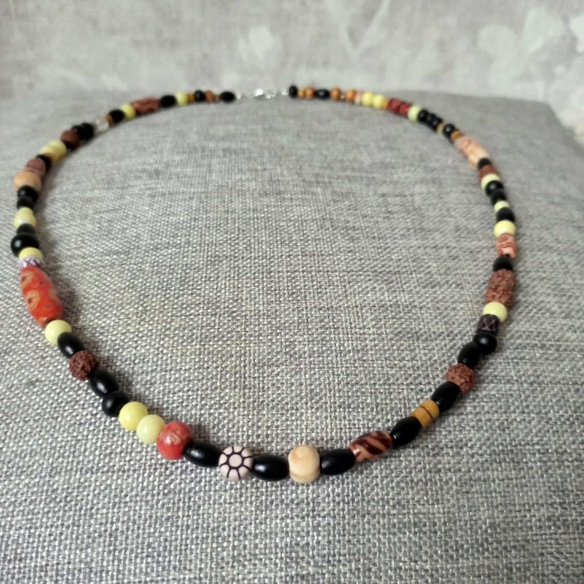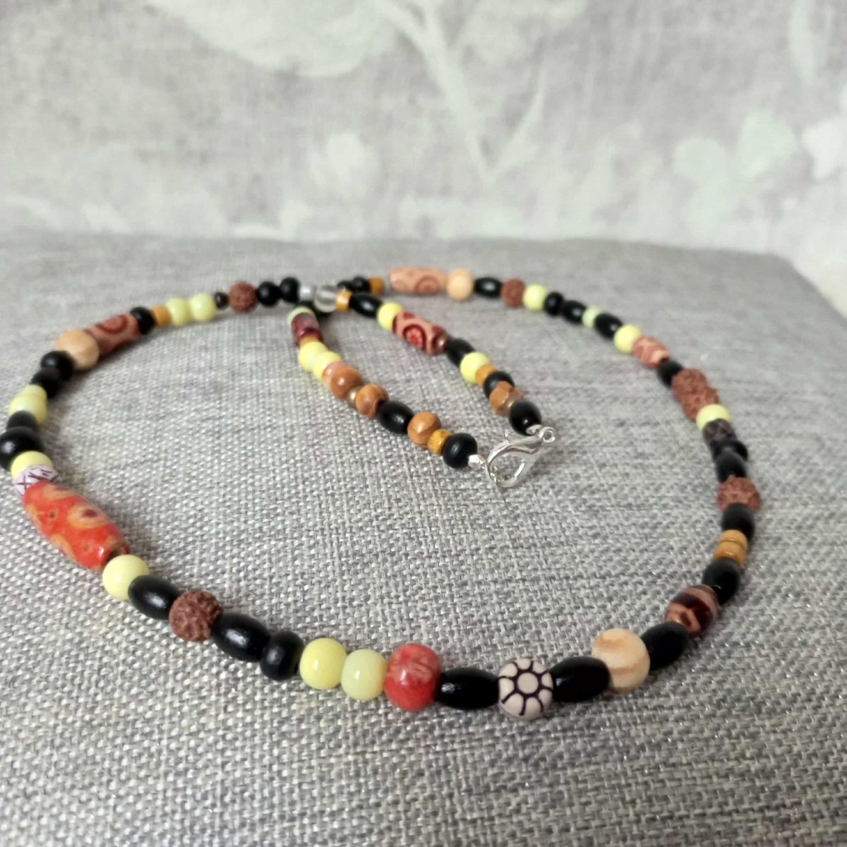 Náhrdelník v etno stylu ze dřevěných a skleněných korálků a semínek rudrakshi. Nejmenší korálky mají 3mm a největší délku 15mm.