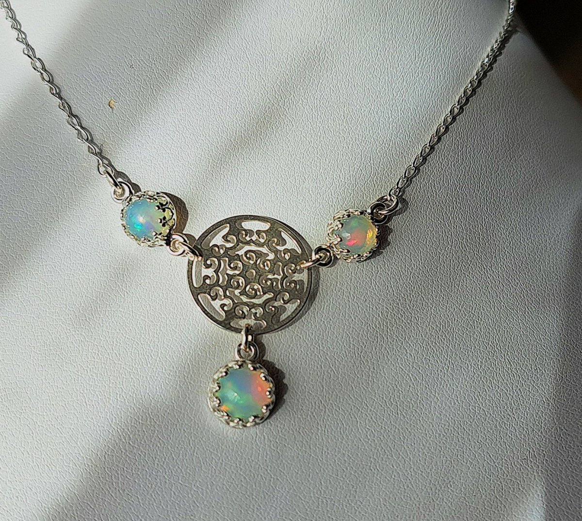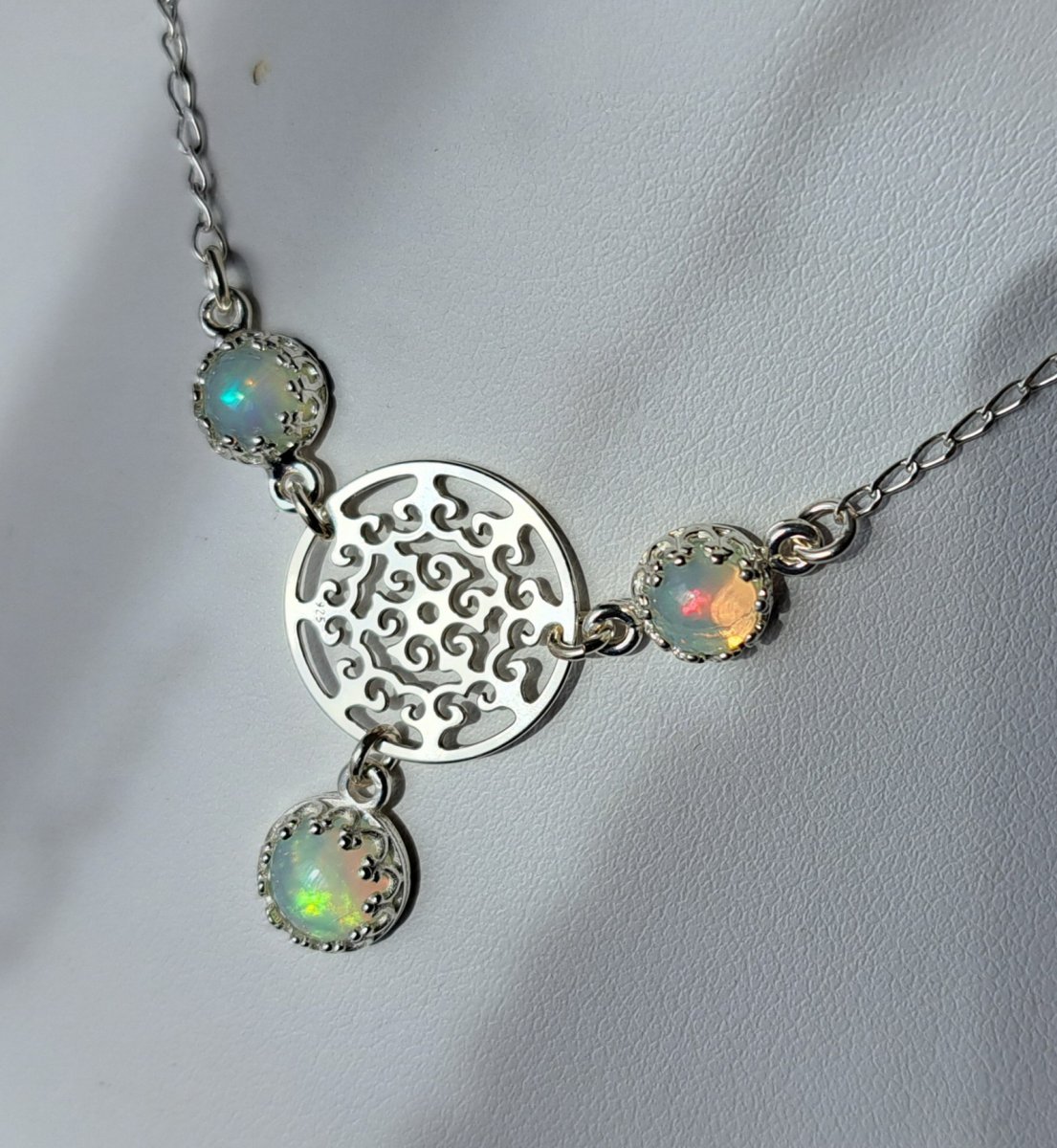 45 cm dlouhý náhrdelník etiopského opálu na stříbrném řetízku a mandalou. Ag 925/1000. Průměr opálku 6 mm a 7 mm. Mandala průměr 16 mm