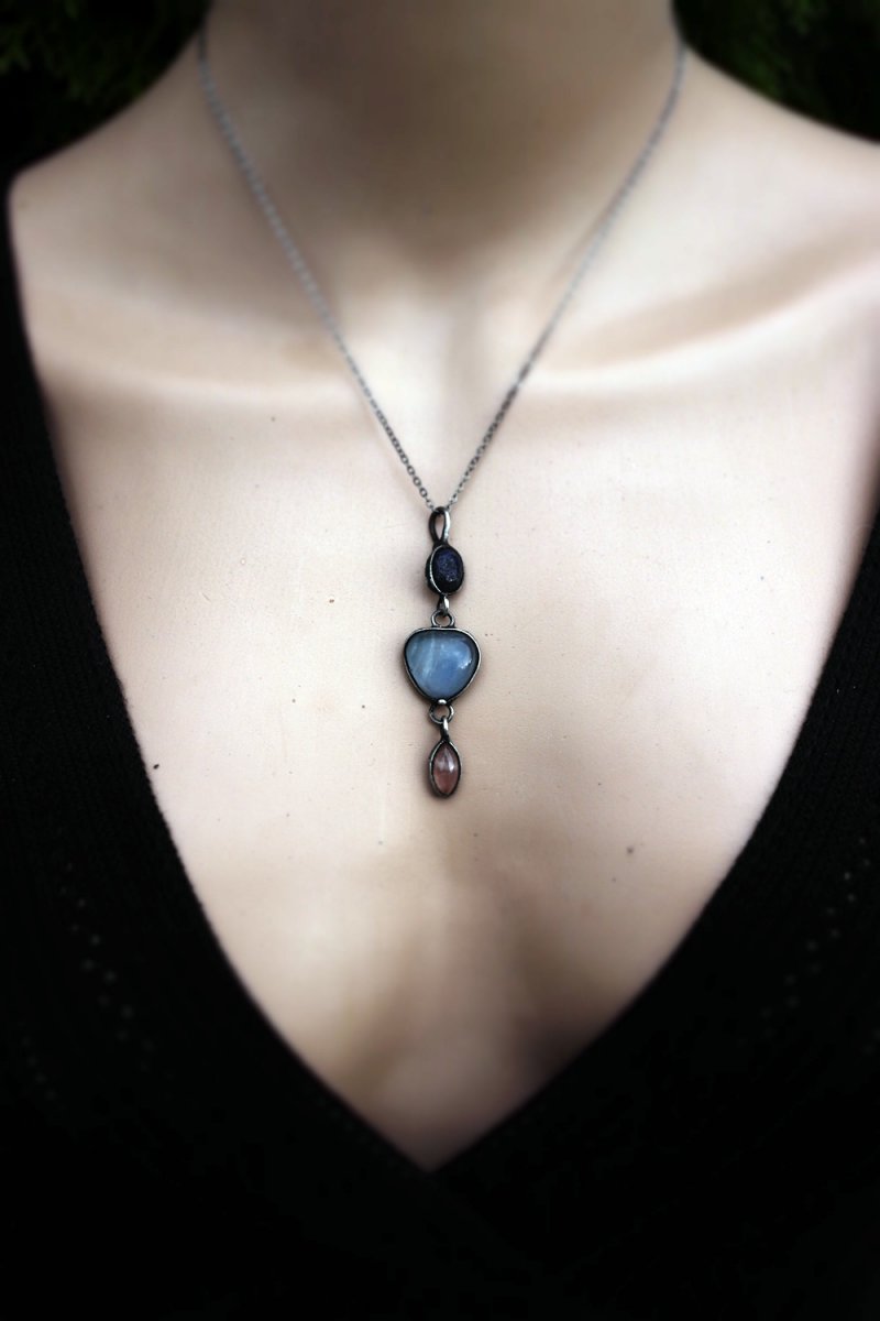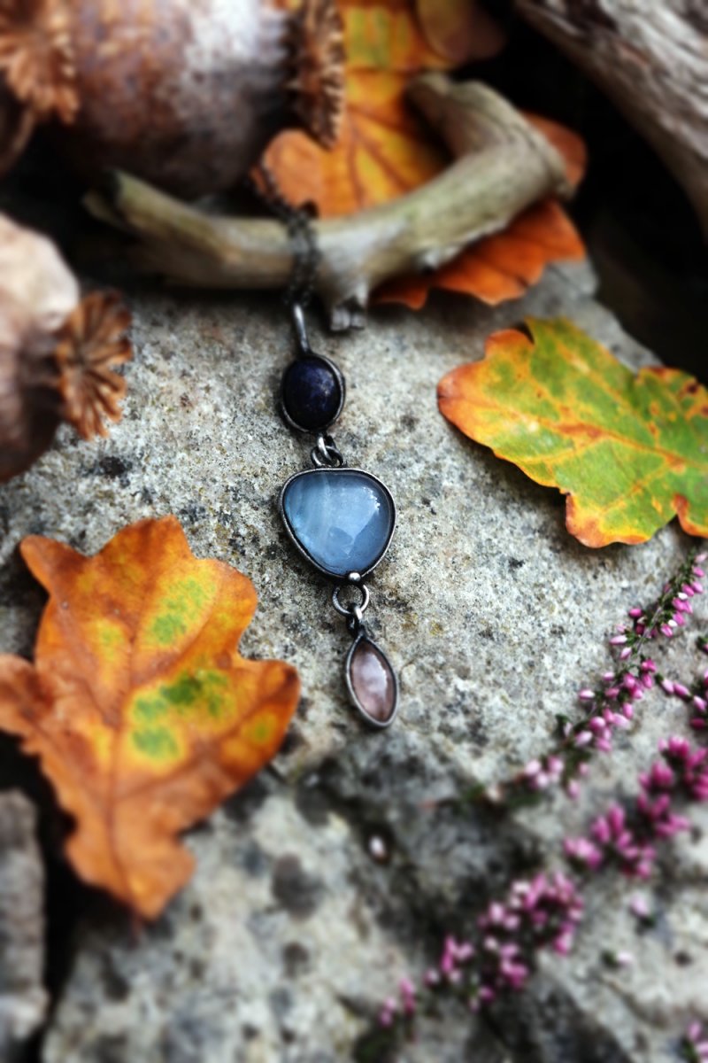 Spojení lapisu lazuli (moudrost a pravda), modrého skla a růženínu (láska a něha) vytváří šperk, který vyrovnává energii těla i mysli. Amulet jako by nesl tajemství hvězdné oblohy.