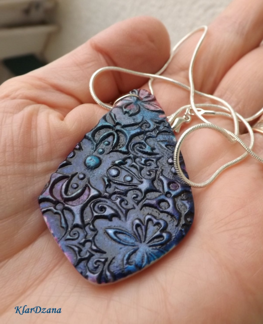 Barva přívěsku: perleťový podklad s texturou, zdobený inkousty a metalickými prášky v odstínech růžové, modré a fialové. Lehce se třpytí a barva se mění v závislosti na světle.