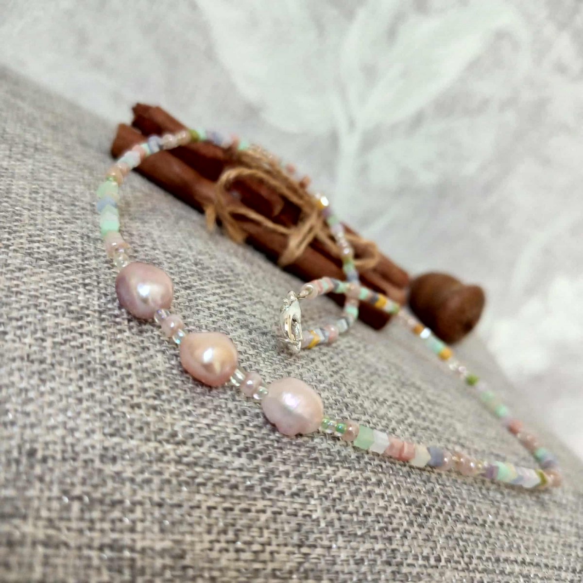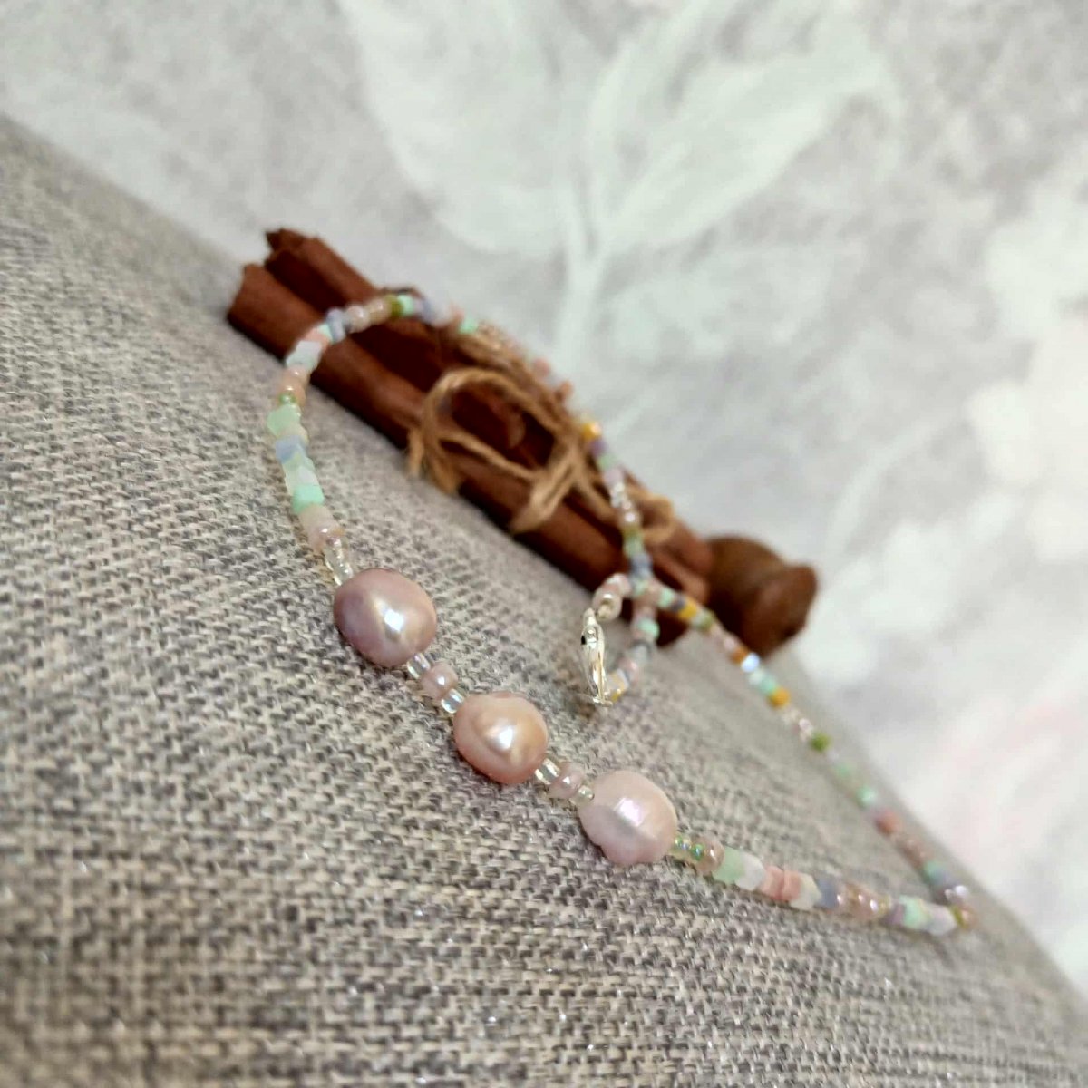 Náhrdelník ze skleněných rokajlových korálků 2mm doplněný skleněnými kostičkami 3mm v pastelových barvách a třemi říčními perlami.