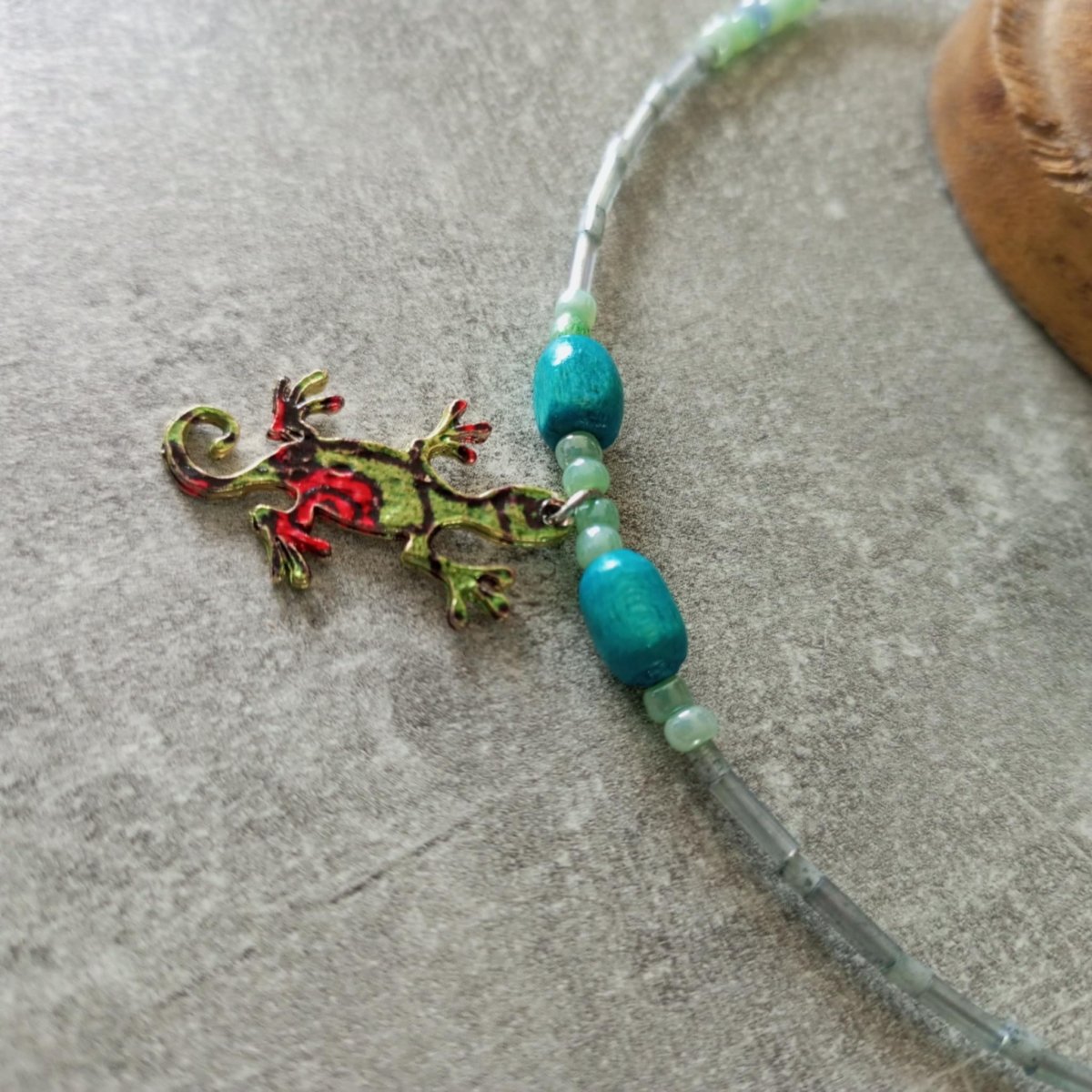 Náhrdelník z rokajlových korálků a dřevěných tyrkysových korálků.