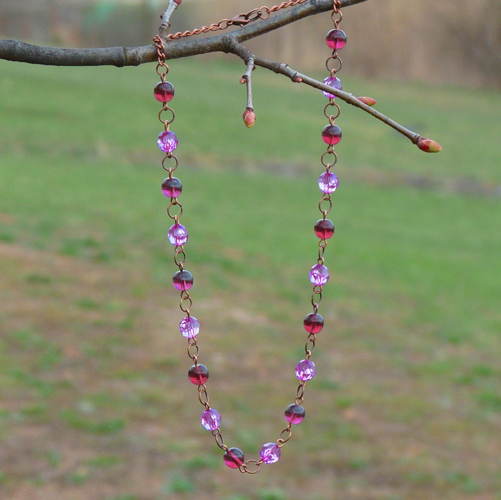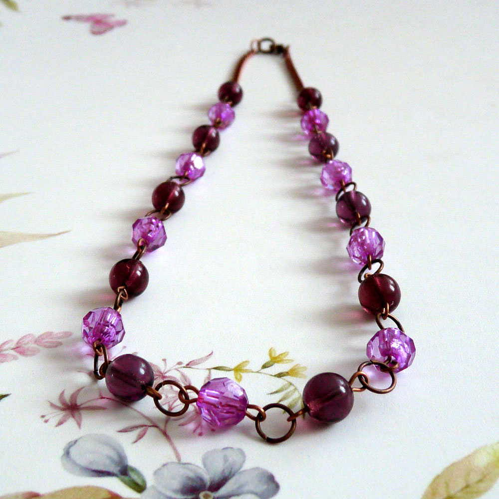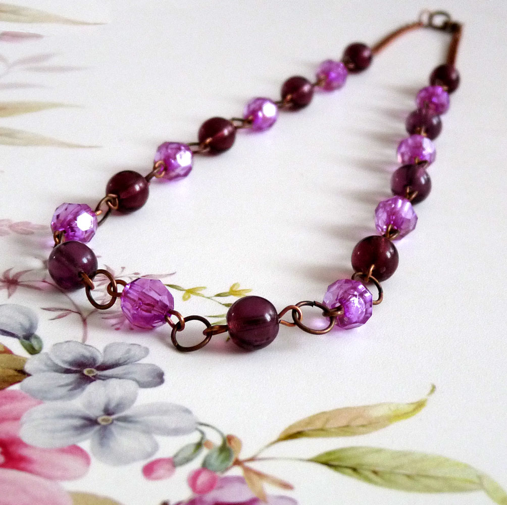 Je tvořen dvěma druhy korálků ve fialové a purpurové barvě a měděnými kroužky.