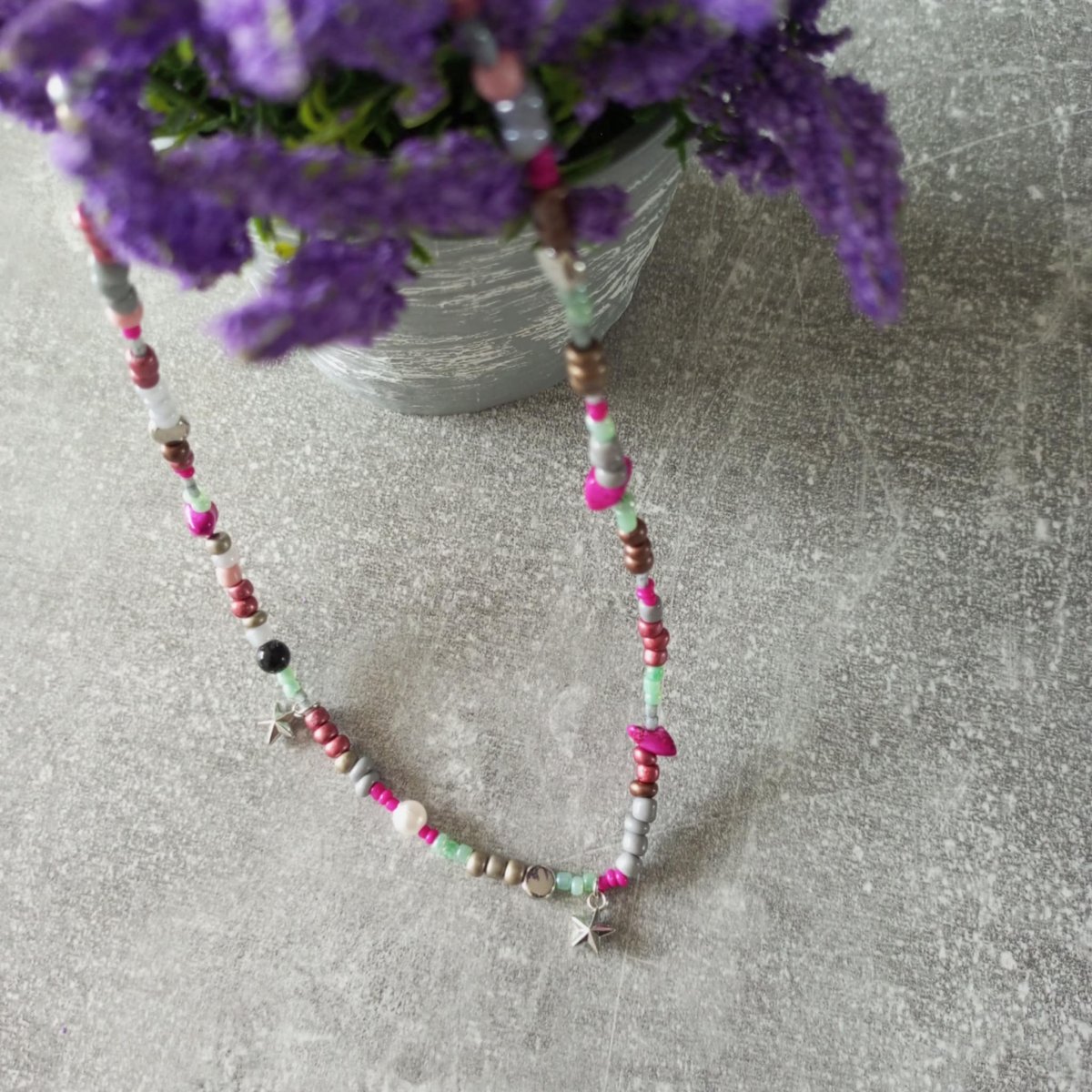 Náhrdelník je z rokajlových korálků , barvených kamínků , CCB korálků a přívěšků hvězdiček.