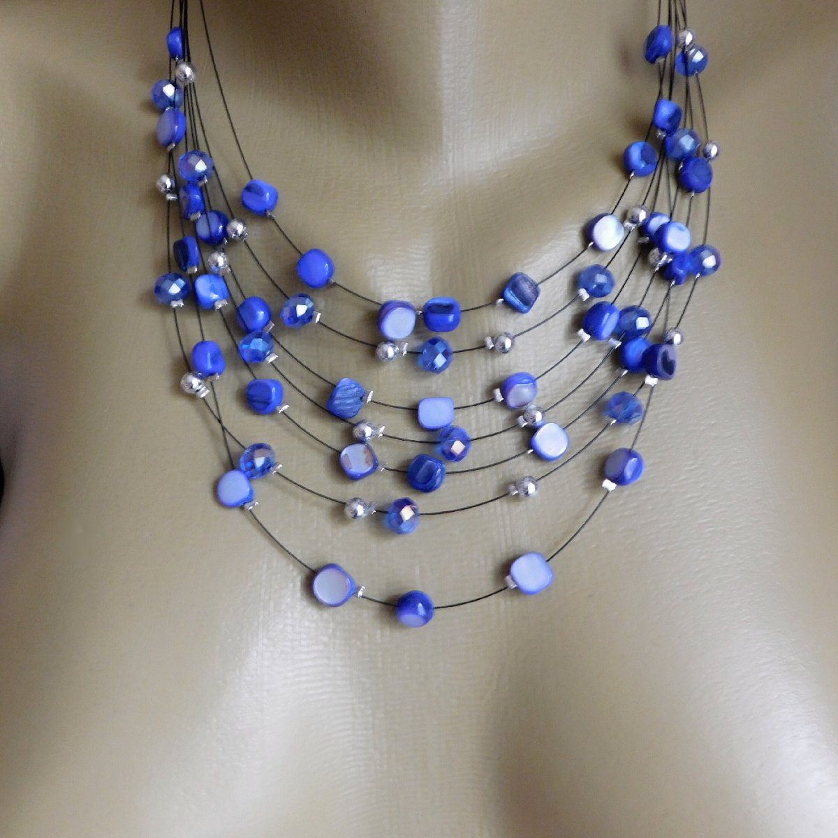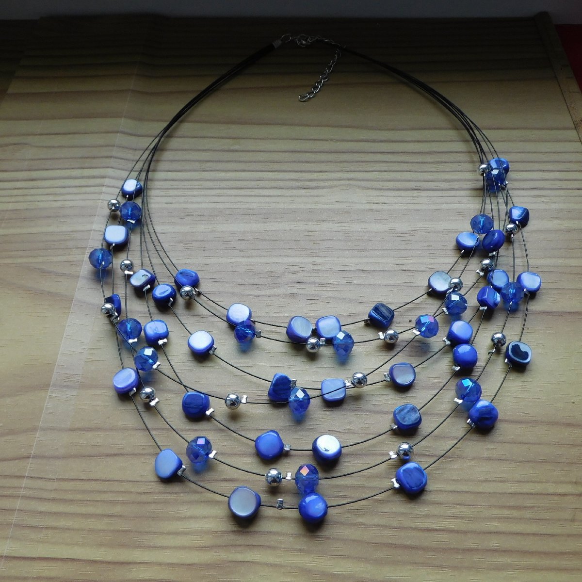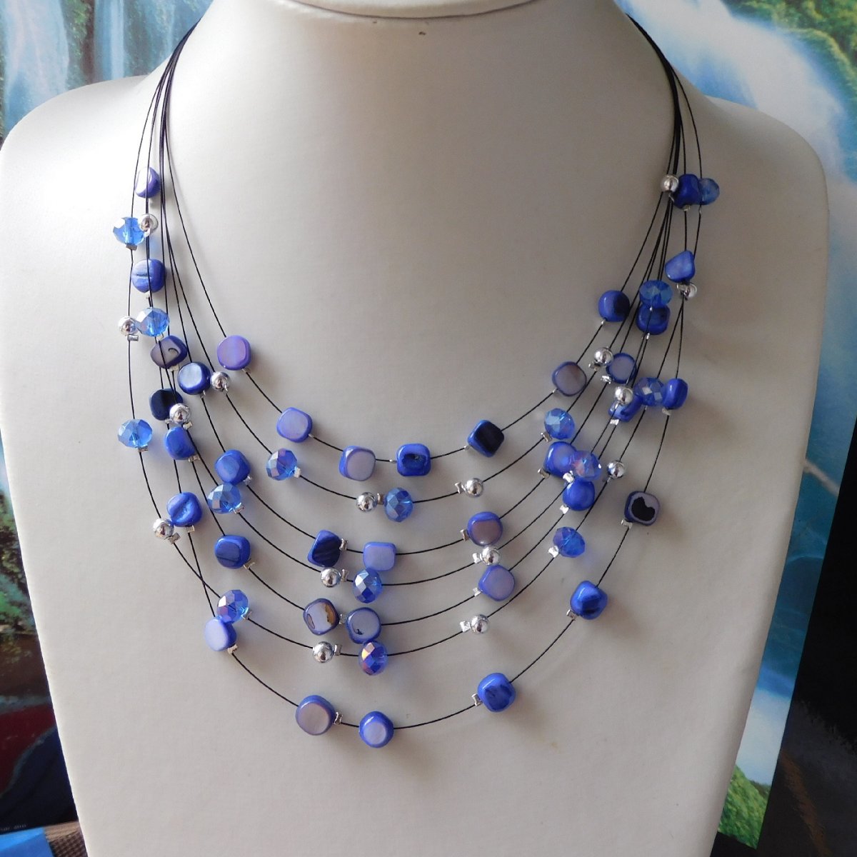Drobná sekaná modrá perleť, navlečená na silonu. Nejkratší délka 45 cm, řetízek na prodloužení.