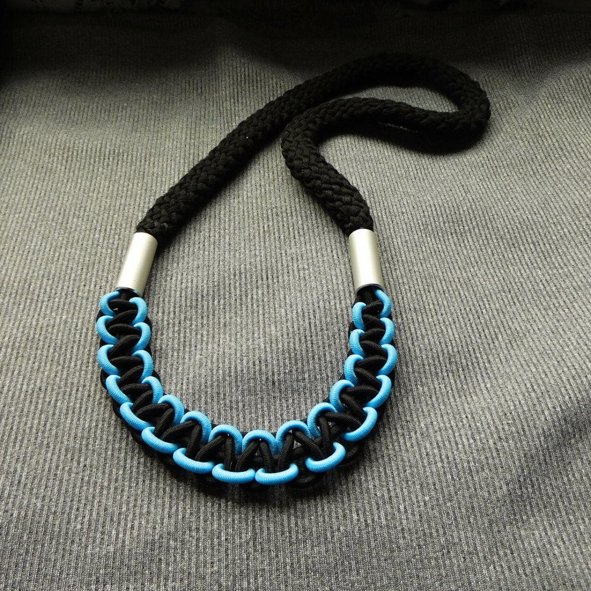 Pletený náhrdelník z černého lana, pletené ozdůbky modročerné a trubiček z eloxovaného hliníku..... .....