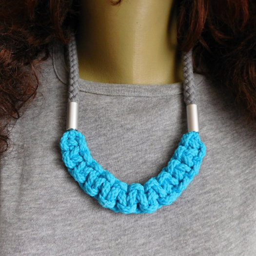 Pletený náhrdelník z šedého lana, tyrkysového a trubiček z eloxovaného hliníku..... .....
