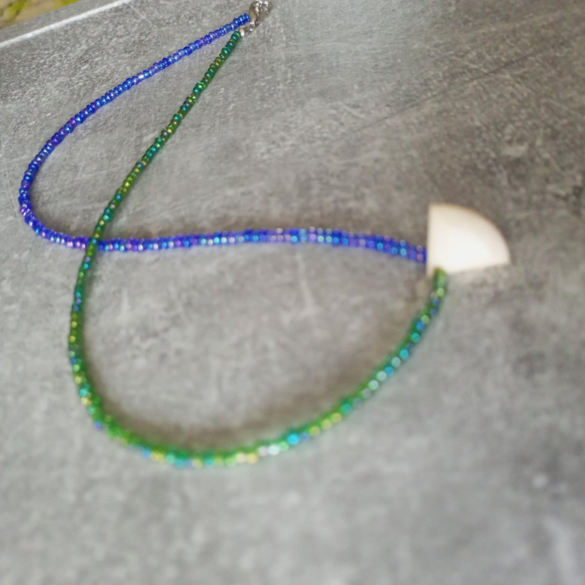 Jemný náhrdelník z modrého a zeleného rokajlu s odlesky..
