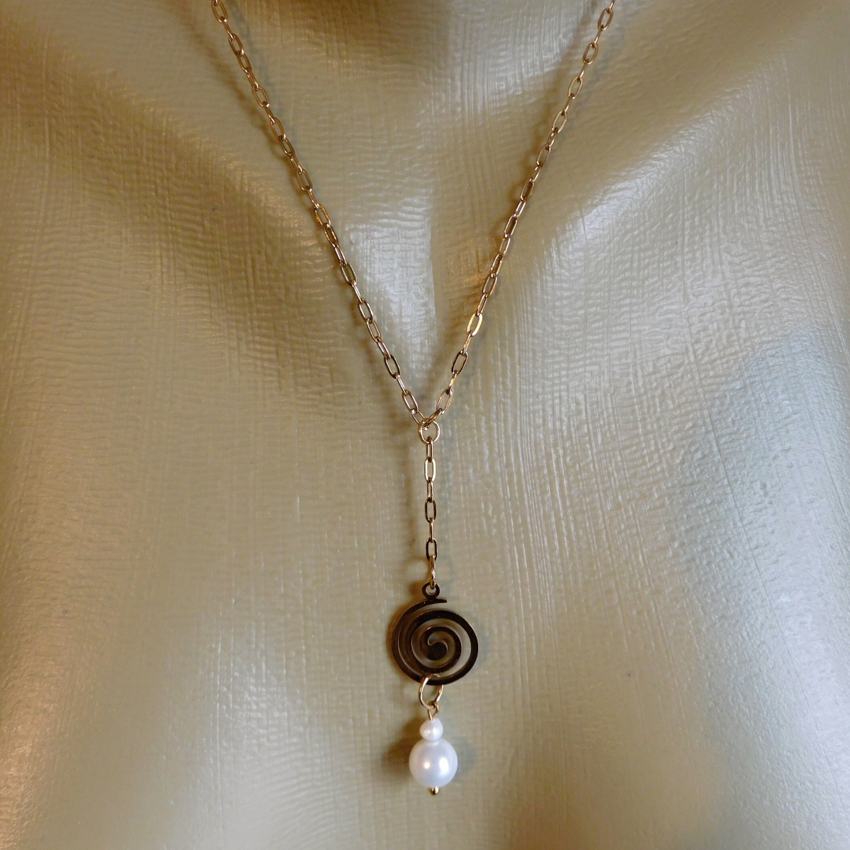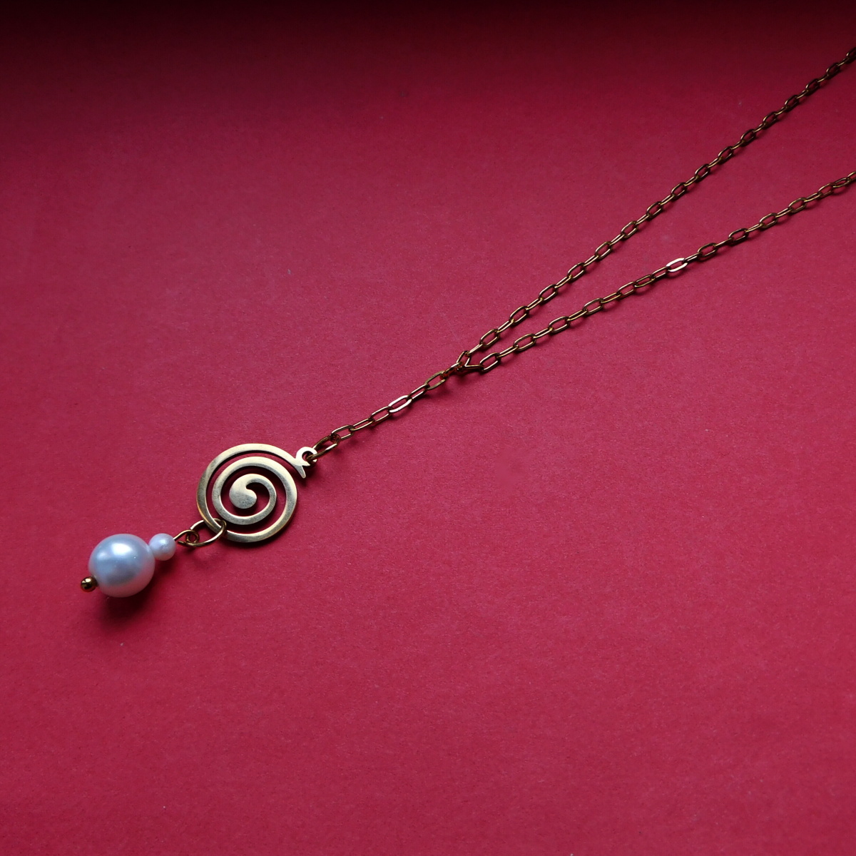 Náhrdelník vyrobený z nerezu ve tvaru Y, pozlacené výše uvedenou metodou. Délka náhrdelníku je 45 cm + necelých 6 cm řetízek ve předu se spirálou /pruměr 13 mm/ se dvěma pravými perličkami, malinkou a větší.