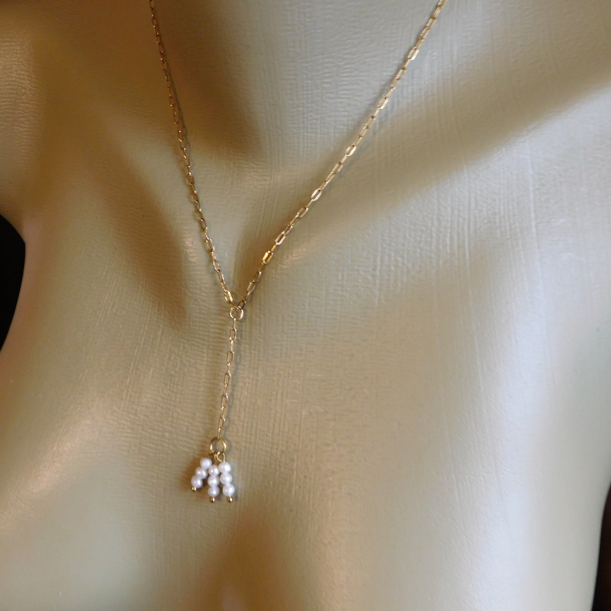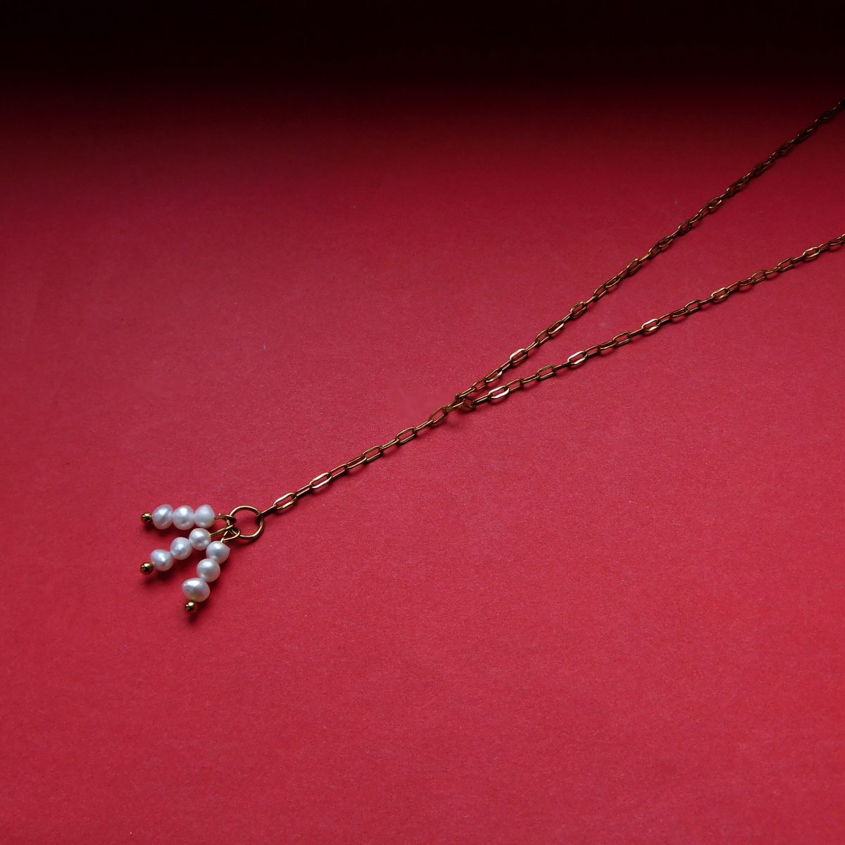 Náhrdelník vyrobený z nerezu ve tvaru Y, pozlacené výše uvedenou metodou. Délka náhrdelníku je 43 cm + necelých 5 cm řetízek ve předu s malinkými pravými perličkami, malinkou a větší..