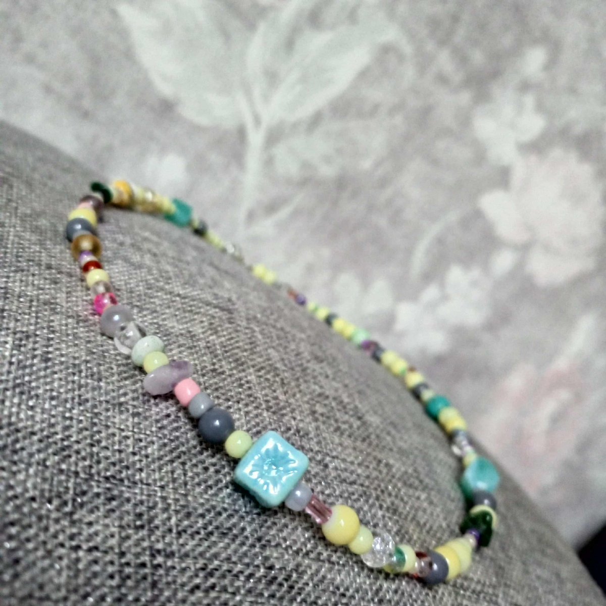 Náhrdelník v jedinečném stylu ze skleněných a akrylových korálků a tromlovaných minerálních kamínků - citrín a chalcedon. Nejmenší korálky mají 3mm a největší délku 10mm.