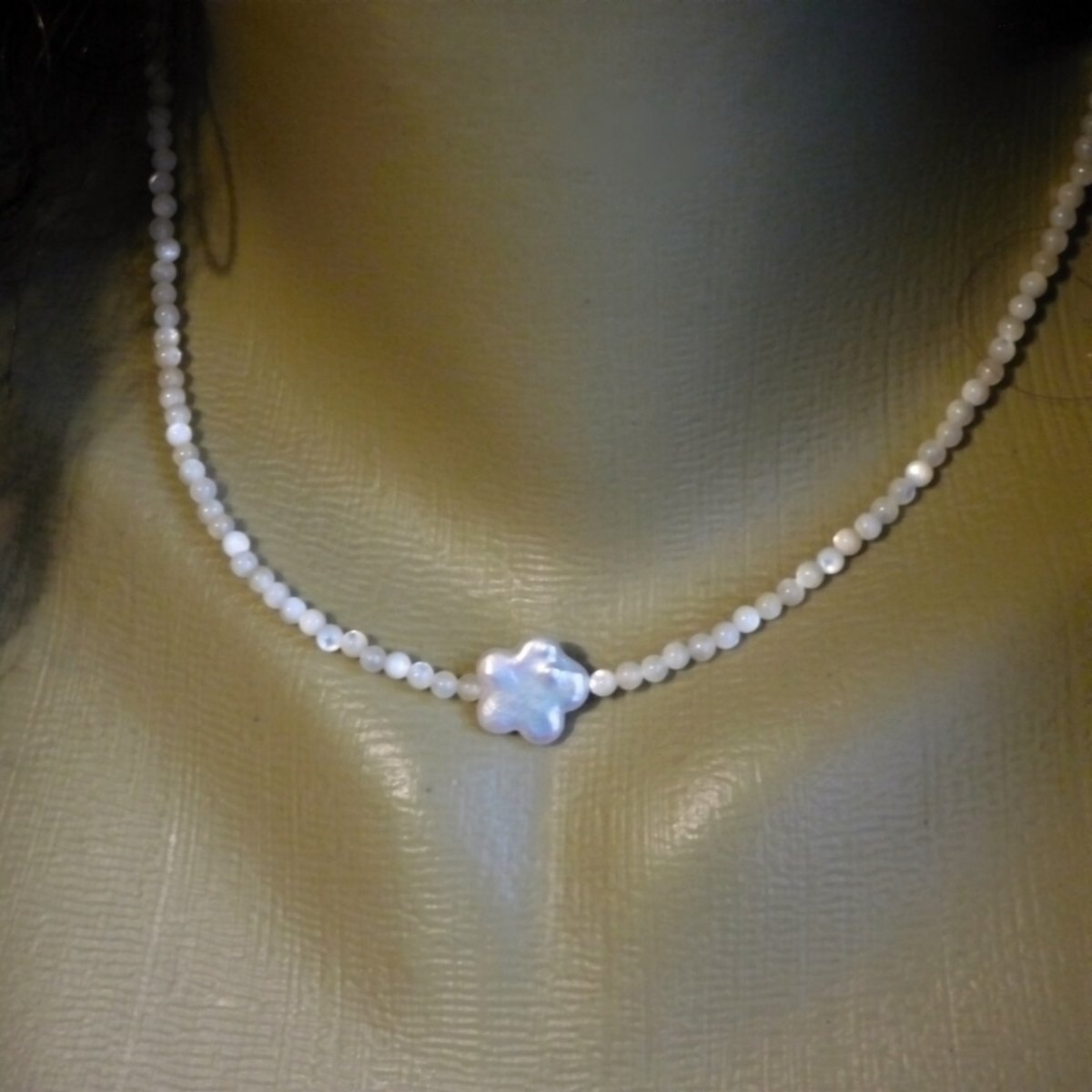 Docela pěkný náhrdelník, vyrobený z malých perleťových korálků, a keshi perličky ve tvaru kytičky.