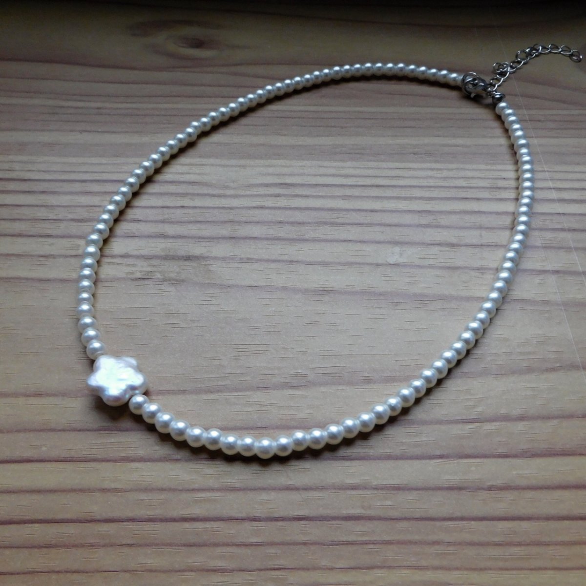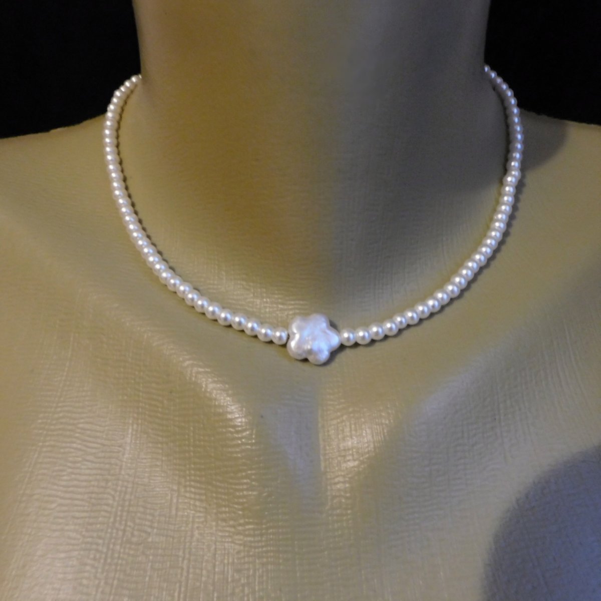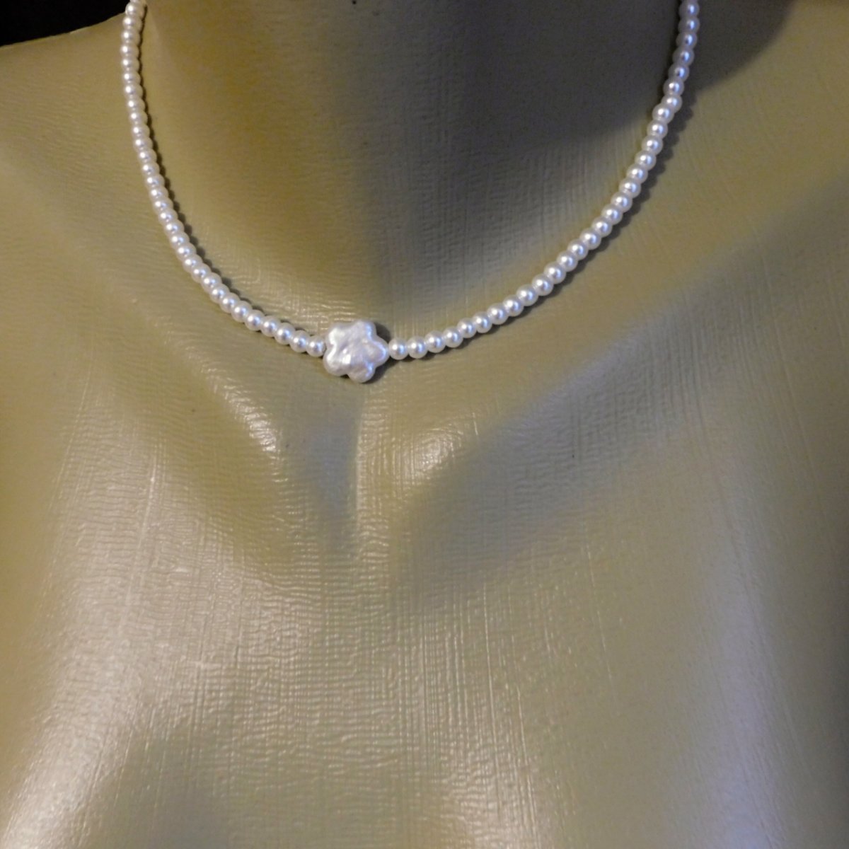 Náhrdelník vyrobený z menších kulatých pravých bilých perliček - velmi pěkné a kvalitní,doplněný malou keshi perlou ve tvaru kytičky