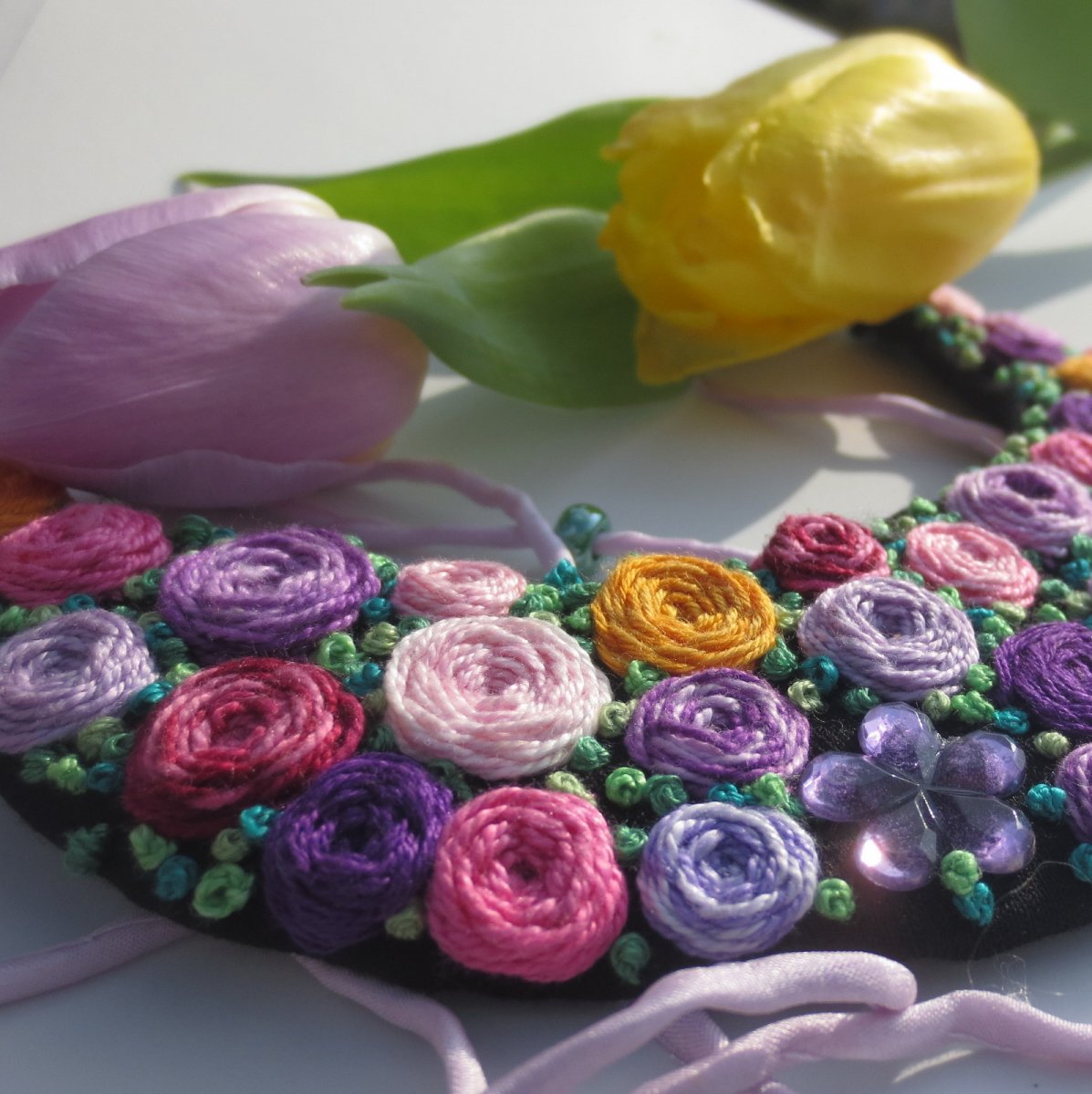 Náhrdelník je ručně vyšívaný na černém podkladu spoustou kvítků v pastelových barvách. Výšivka je plastická. Nepřehlédnutelný šperk, přitom jemný, lehoučký.