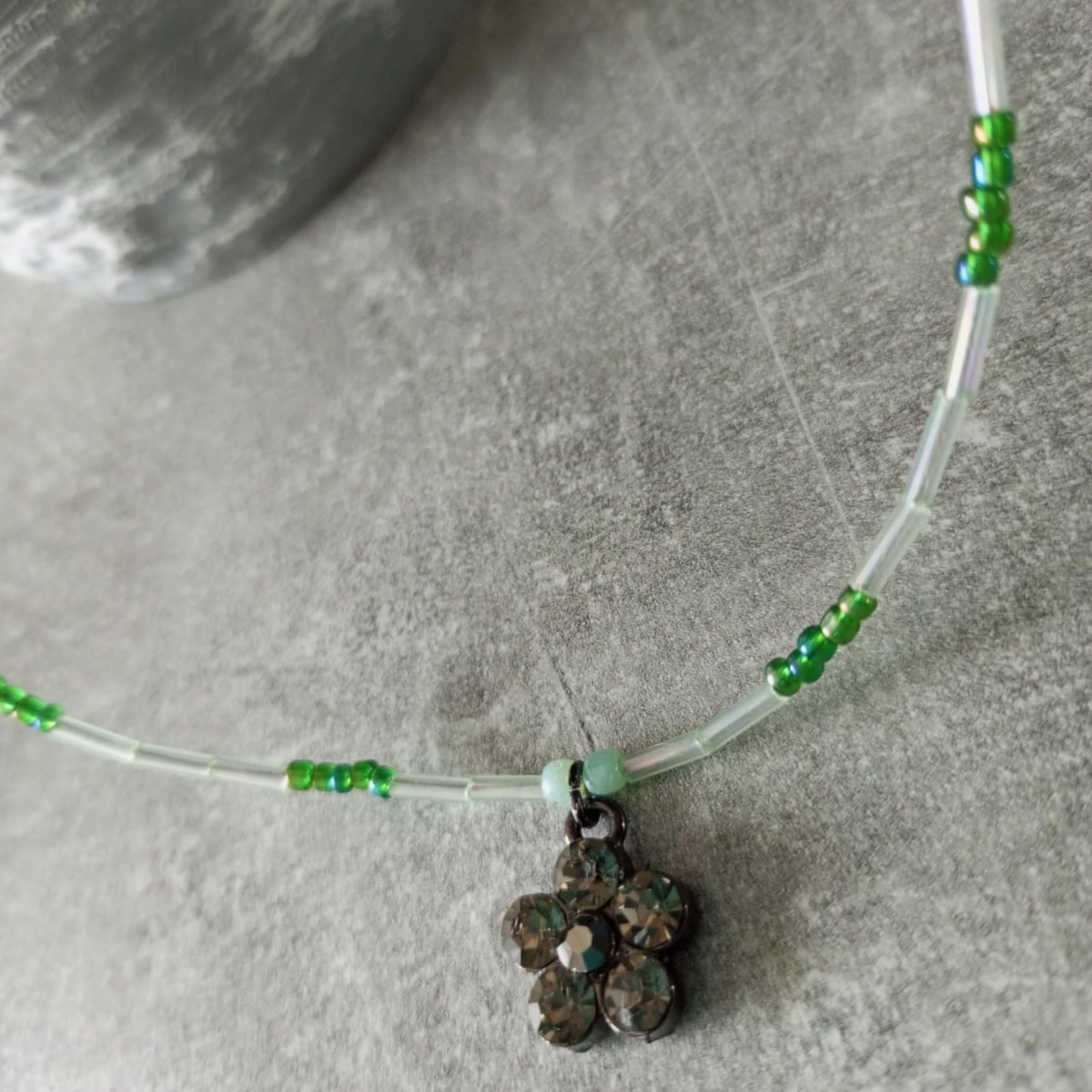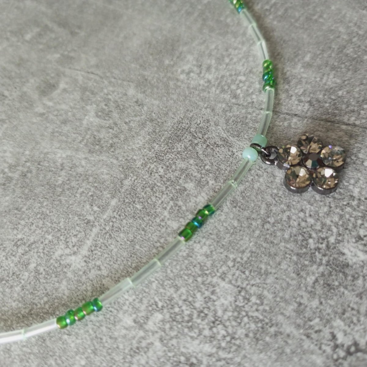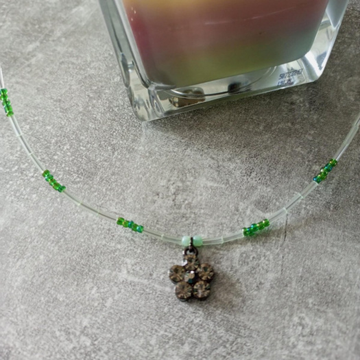 Náhrdelník ze skleněných rokajlových korálků . Přívěšek kytička se štrasovými kaminky.