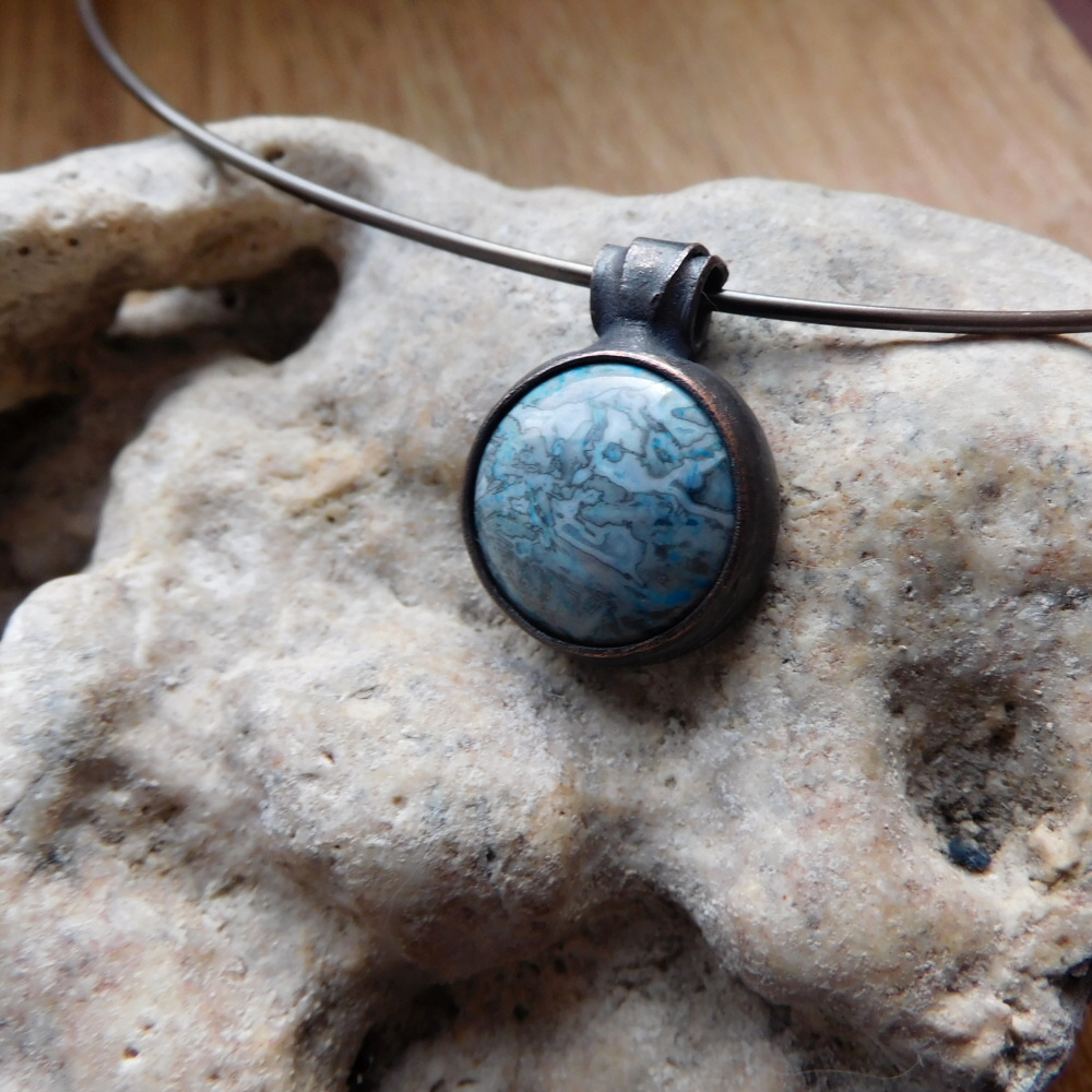 Zavěšeno na nerezové patinované obruči, je v ceně, může být i kulatá kůže nebo měděný řetízek , délka 50 cm.