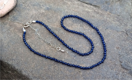 Náhrdelník z broušeného nejjemnějšího modrého safíru vysoké kvality se zapínáním na kulatou karabinku s prodlužovacím řetízkem zakončeným drobným přívěskem. Průměr kamenů 2,5 mm.