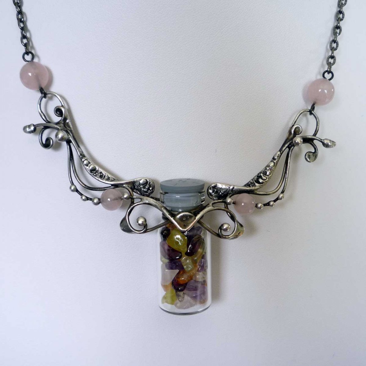 Autorský šperk zhotoven z bezolovnatého cínu se stříbrem, kuliček růženínu, zlomků růženínu, ametystu, jadeitu,citrínu,křišťálu a granátu, skleněné lahvičky a drátu.