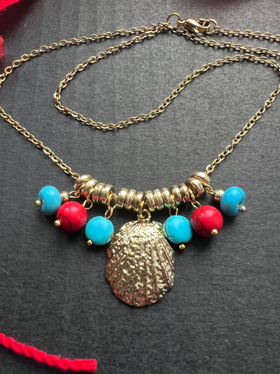 Zlatý přívěskový náhrdelník - mušle a tyrkenitové korálky - přívěsky na tenkém zlatém řetízku. Řetízek je z nerez oceli, zlaté ozdoby běžný kov. Délka 45 cm, zapínání karabinka.