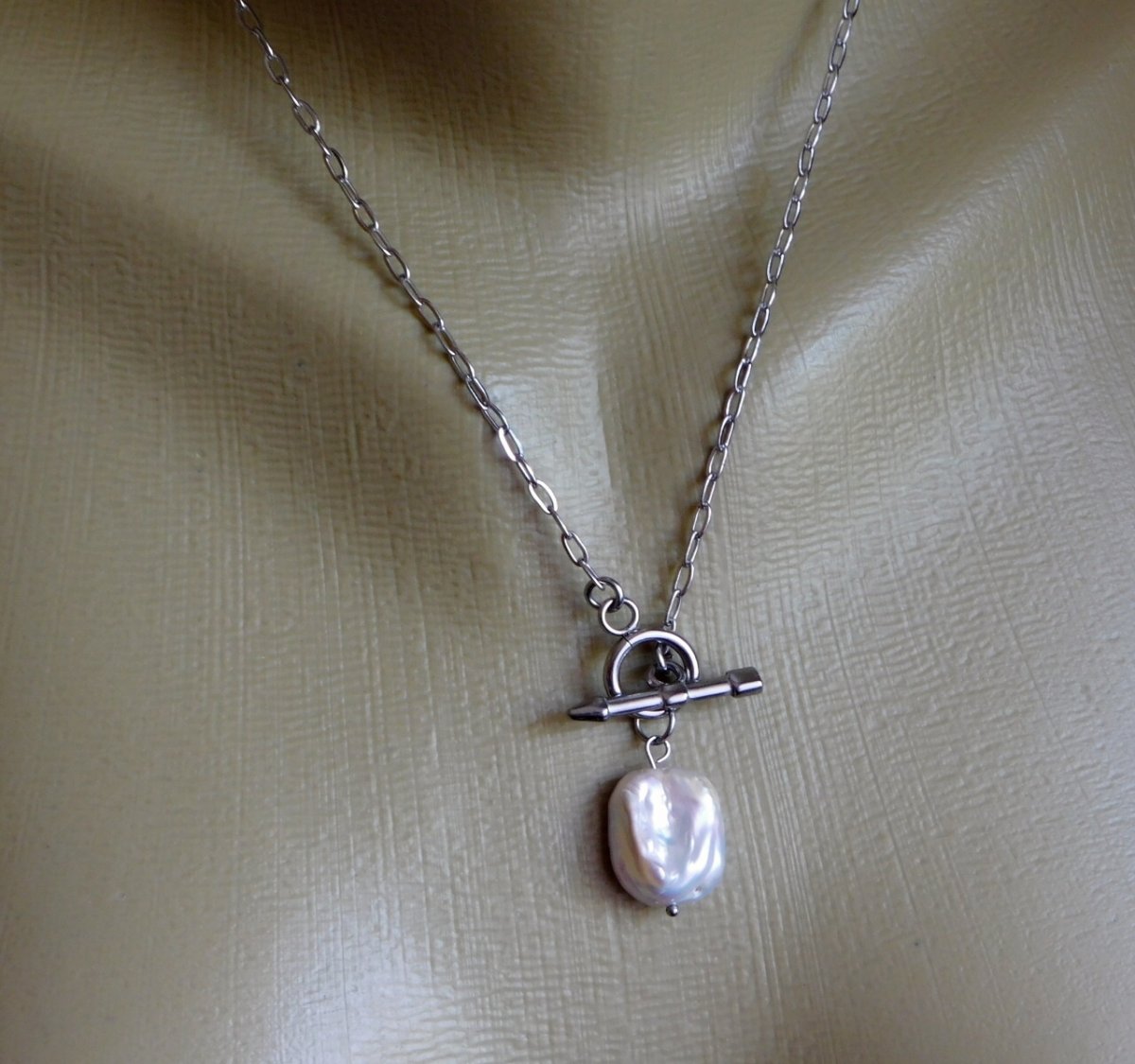 Náhrdelník z nerezového materiálu s velkou keshi perlou.....a nerezového amerického zapínání vpředu..