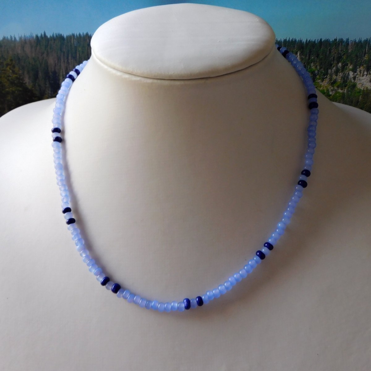 Náhrdelník je vyrobený z malinkých modrých skleněných korálků a tmavě modrých korálků- preciosa, rokajl