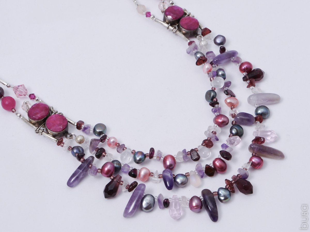 Perla, ametyst, granát, křemen, ahát, sklo.