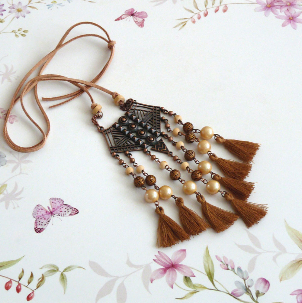 Dlouhý náhrdelník s bohatým závěsem a koženými šňůrkami ve světle hnědé barvě