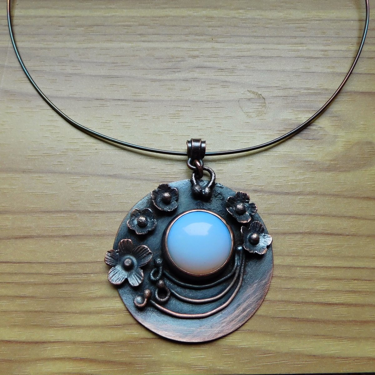 Tento měděný přívěšek má průměr 5 cm, uvnitř je opalit o průměru 20 mm.Květy stupňovitě seřazené okolo kamene.
