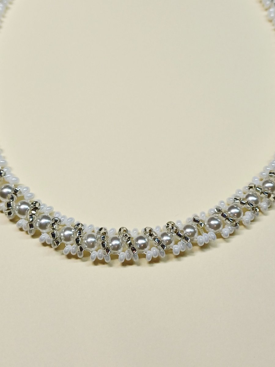Náhrdelník je šitý z bílých a průhledných korálků Preciosa, doplněny perličkami 0,5 cm