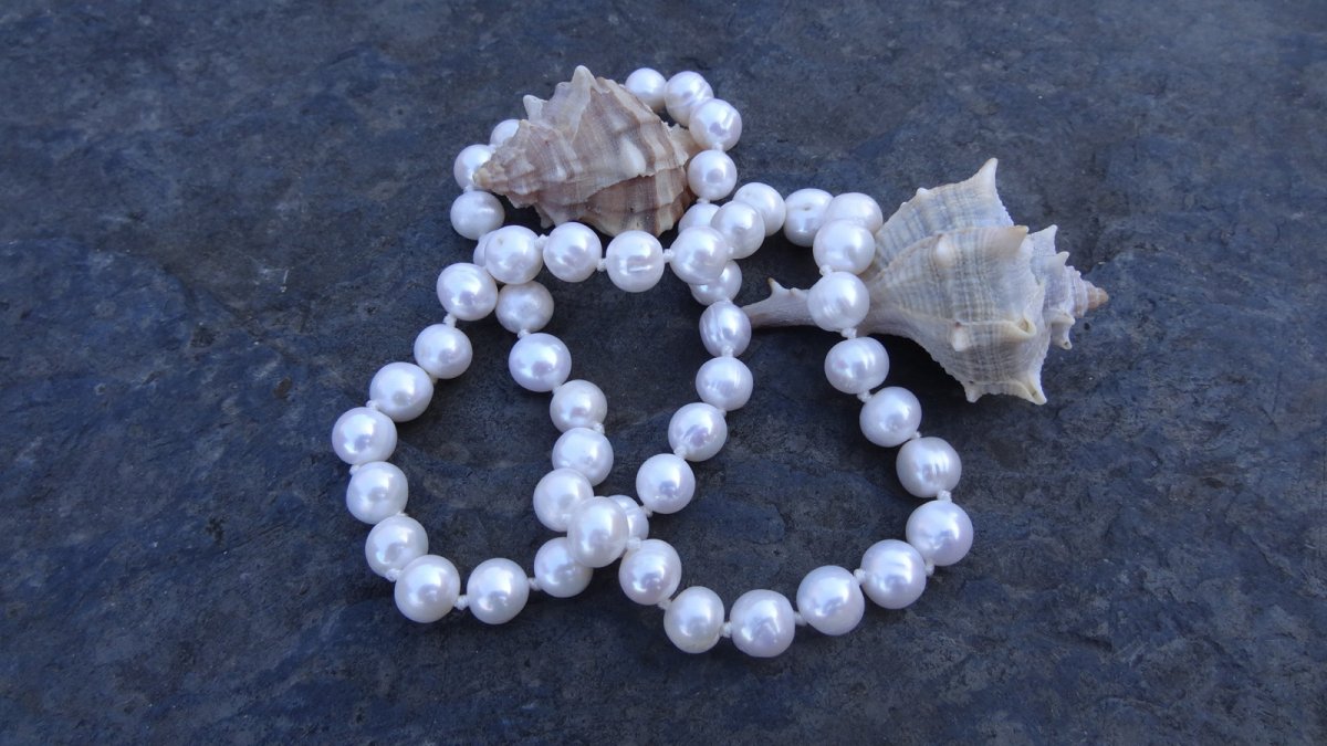Bílé téměř kulaté mořské perly o průměru cca 7-8 mm vysoké kvality na hedvábí s kulatým zlatým zapínáním. Jednotlivé perličky jsou od sebe oddělené uzlíkem proti vzájemnému odírání. Délka náhrdelníku 44 cm.