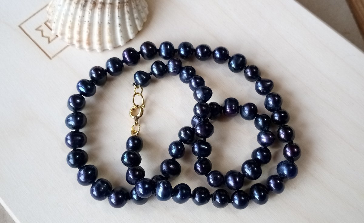 Tmavě modré dokonale lesklé říční perly o průměru cca 8 mm navlečené na hedvábí uzlíkovou metodou s pozlacenou karabinkou. Jednotlivé perličky jsou od sebe oddělené uzlíky proti vzájemnému poškrábání, nebo také pro lepší ohebnost náhrdelníku.