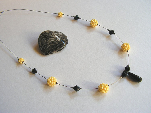Náhrdelník vyrobený ze skleněných korálků, žlutý rokail má perleťový lesk. Délka náhrdelníku je 59 cm.