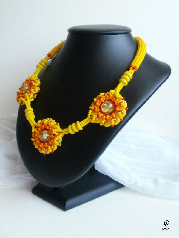 Použitý materiál je kvalitní skleněný rokajl, bez bižuterního kovu – ideální volba pro alergiky. Zapínání je rovněž šité, ve tvaru stylového OT, což podtrhuje celkovou originalitu šperku. Náhrdelník má délku 55 cm a každý květ má průměr 3,5 cm.