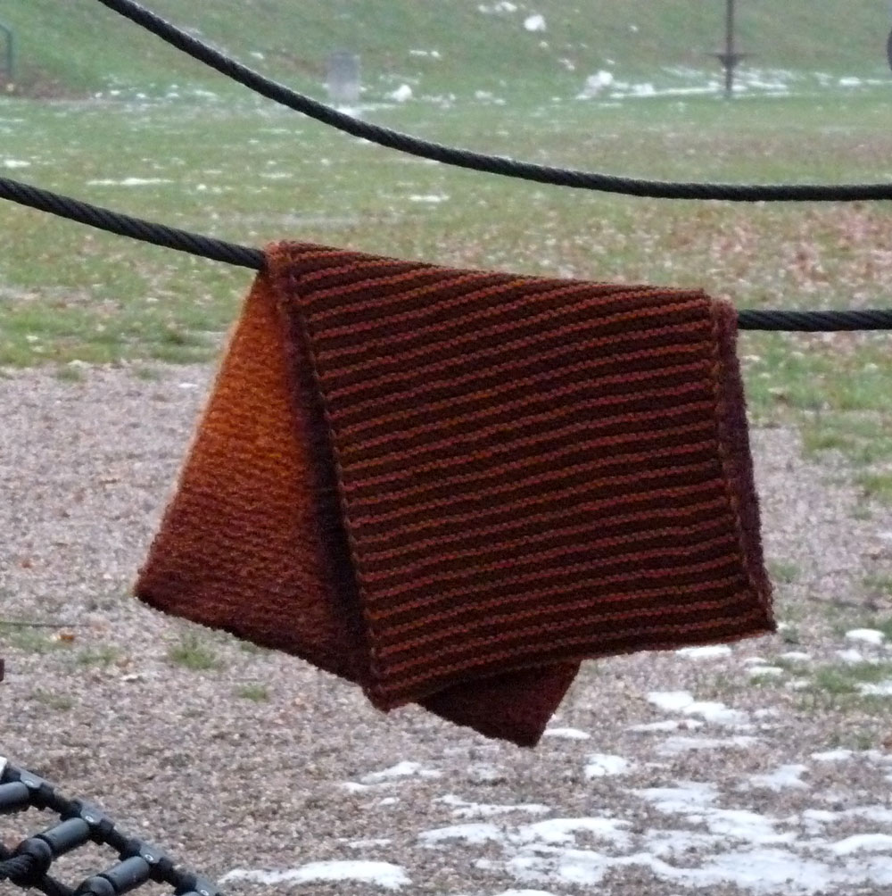 Druhá polovina je pletená ze silnějších akrylových přízí, které jemně pruhují ve světle a tmavě hnědé barvě