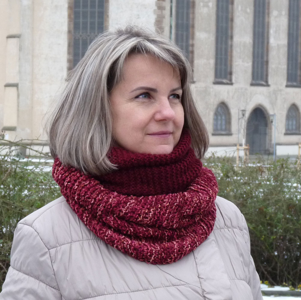 Nákrčník je pletený z jedné poloviny jednobarevnou vínovou přízí a z druhé poloviny slabou vínovou přízí spolu s jemným vínovorůžovým melírem v úpravě mininopek