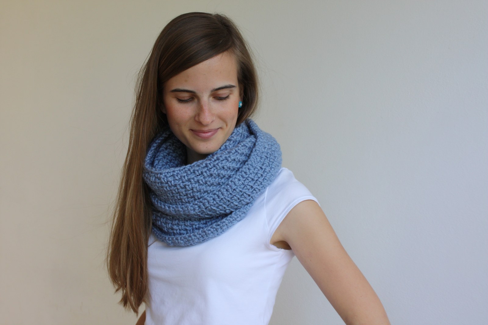 Háčkovaný a velmi příjemný nákrčník v šedo-modré barvičce. Nákrčník je háčkovaný pružným vzorkem, příze je příjemně měkká a teplá.