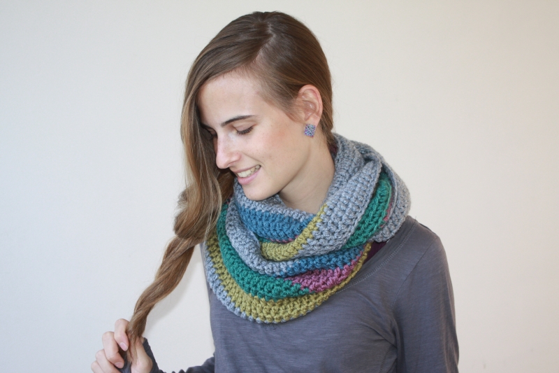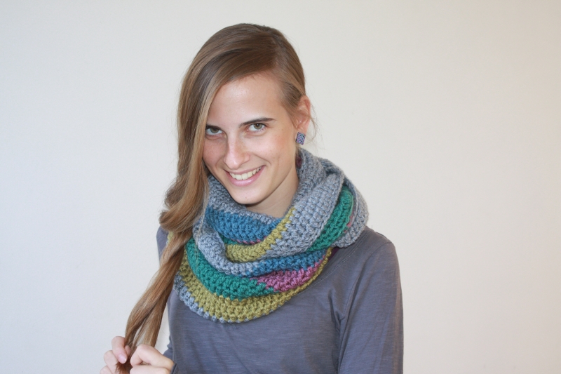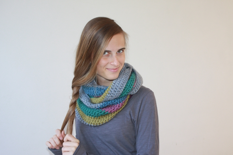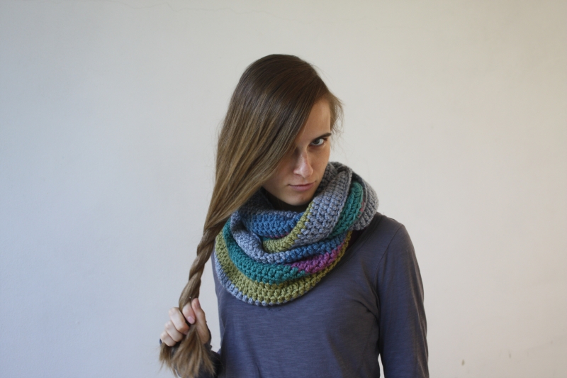Háčkovaný nákrčník z nové kolekce "Pruhy" v odstínech šedé, petrolejové, starorůžové, zelené a zelenožluté.