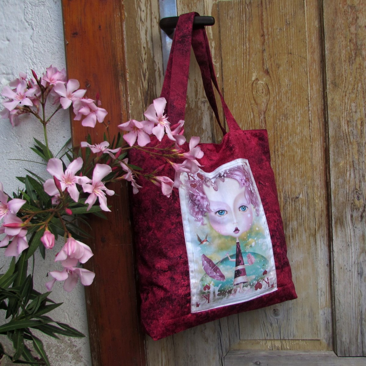 taška ušitá z bavlněné mramorované látky v červenou růžovo černých odstínech