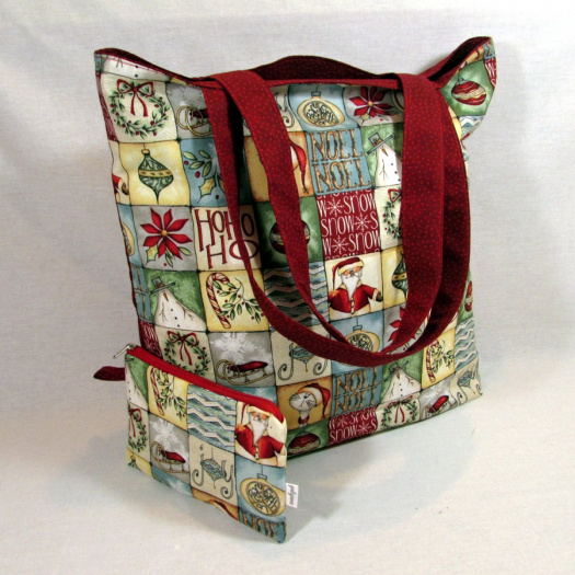 taška ušitá z puntíkaté červené látky,přední strana z barevné oblíbené vánoční látky