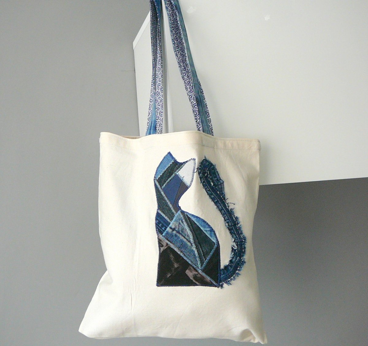 Nákupní taška s riflovou aplikaci pro malé i velké nákupy. Ušitá z pevné režné látky.
