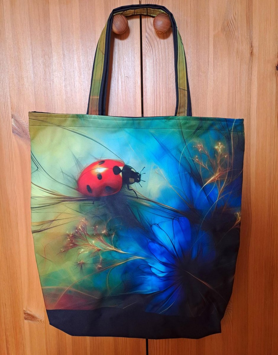 Lehká nákupní taška z nepromokavé kočárkoviny, bez podšívky. Obrázek je z obou stran. Lze složit do malého balíčku. Rozměry: š 41 cm, v 44 cm.