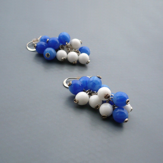 Náušnice jsou tvořeny z větších bílých a modrých žíhaných skleněných korálků.