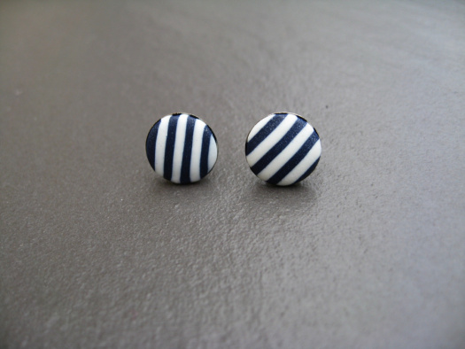 Náušnice tvořené malinkými kovovými puzetkami, ve kterých jsou vložena pruhovaná kolečka z polymerové hmoty Fimo. Průměr lůžek cca 1 cm.