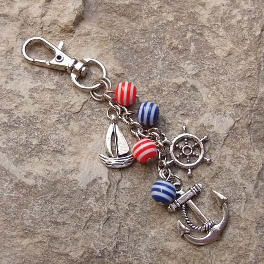 Přívěsek je vyroben z pruhovaných akrylových korálků a komponentů v barvě stříbra naketlovaných na řetízek. Je 10 cm dlouhý včetně karabiny.