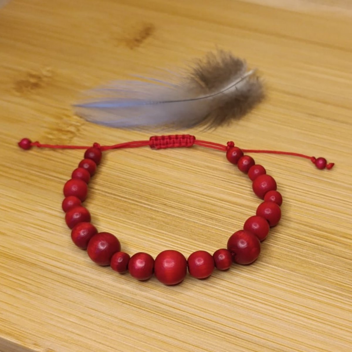 Náramek navlékaný z dřevěných korálků a tkaný technikou macramé z nylonové šňůry.Korálky jsou průměru 4, 6, 8 a 10 mm.Neobsahuje žádný kov - vhodný pro alergiky.